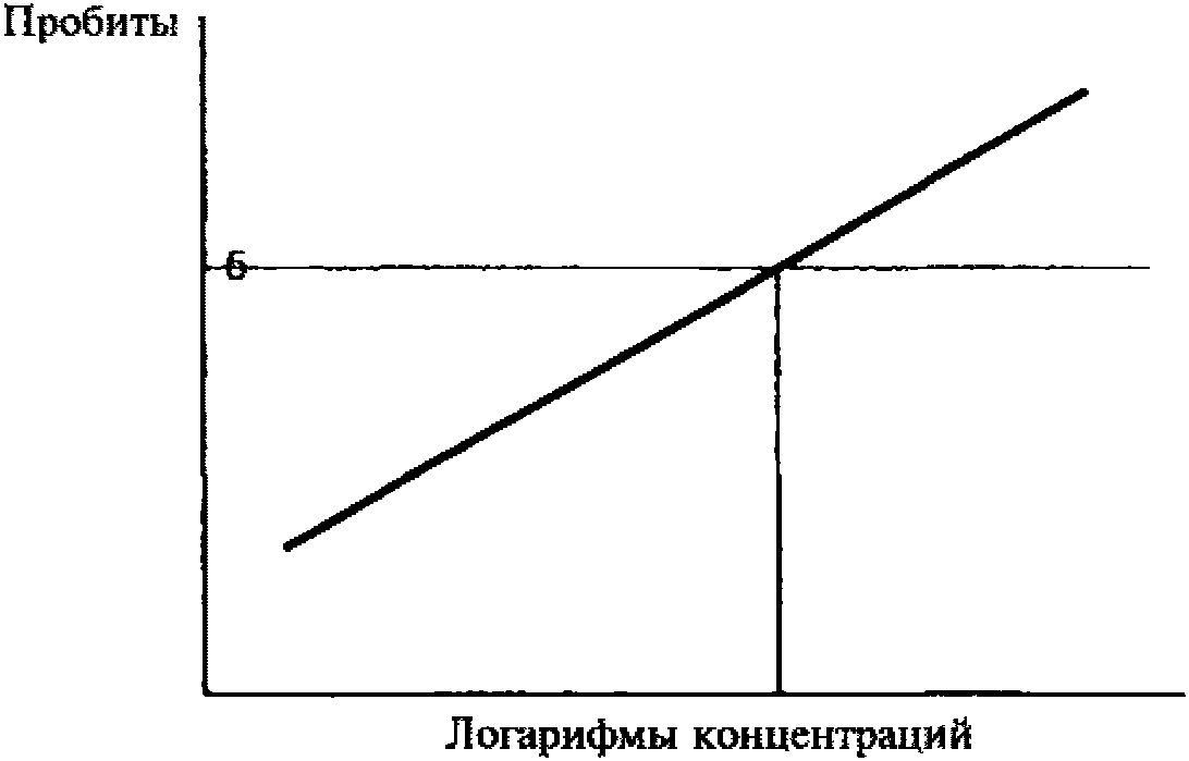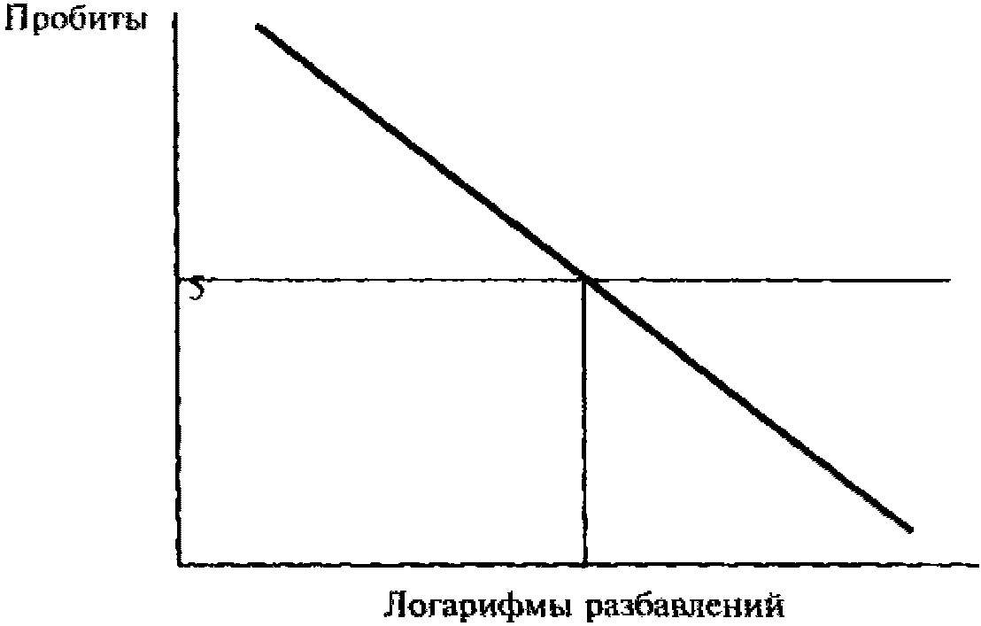 (табл. В.1). Через полученные точки проводят прямую. Потом из точки на оси ординат, которая соответствует 5 пробитам (50%), проводят линию, параллельную оси абсцисс, до пересечения с линией графика. Из точки пересечения опускают перпендикуляр на ось абсцисс. Точке пересечения перпендикуляра и оси абсцисс соответствует десятичный логарифм ЭК