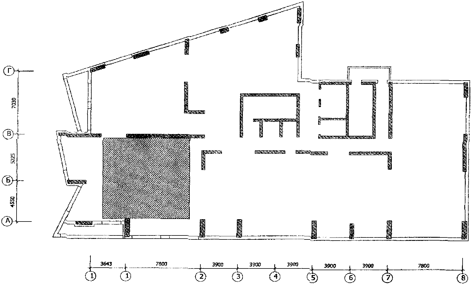 рисунке А2.1 представлен план 2 этажа здания. В здании имеется четыре технических этажа (19, 33, 48 и 63 этажи). Все этажи здания, за исключением технических и расположенных под ними этажей, имеют одинаковое архитектурно-планировочное и конструктивное решение. По контуру здания с шагом 9 м установлено 14 прямоугольных колонн, из которых 8 основных колонн (на осях 2, 4, Б и Г на