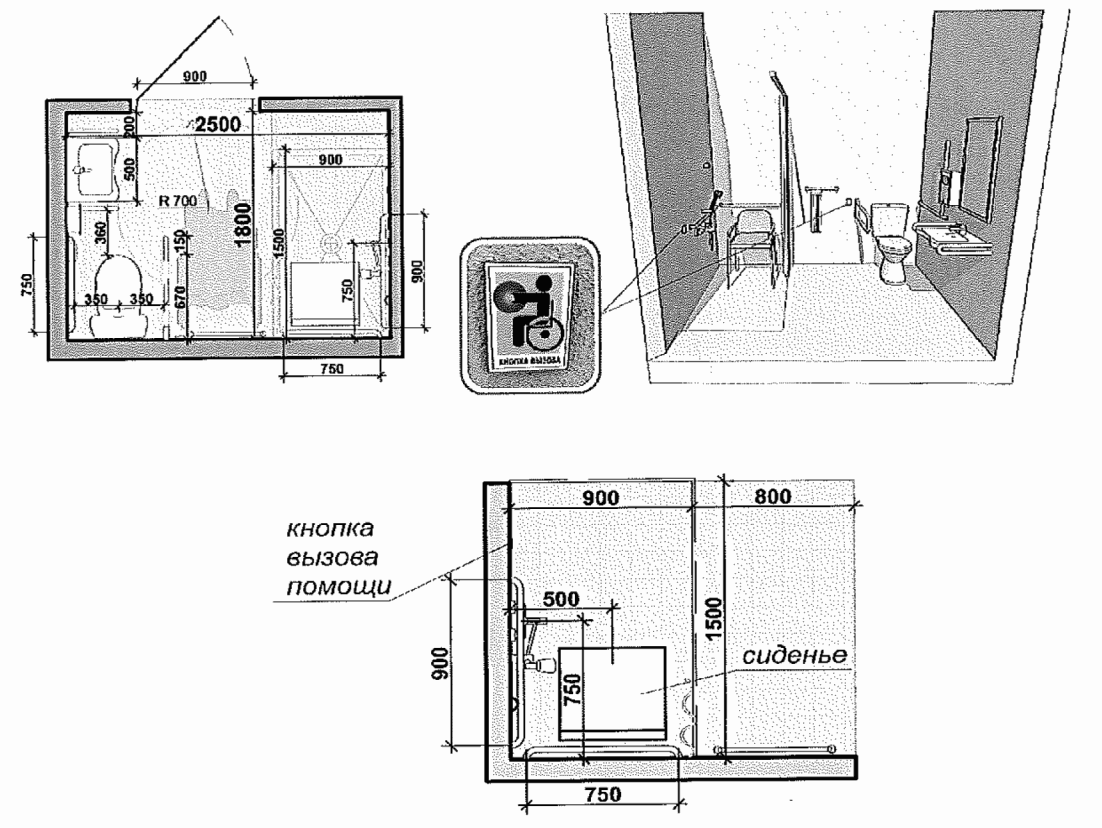 - минимальные размеры доступной кабины санузла (с унитазом): ширина 1,65 м, глубина 2,20 м;