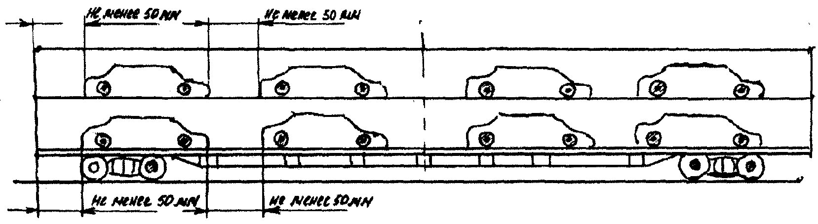 2.2.3. На каждом ярусе вагона автомобили размещают симметрично относительно продольной и поперечной плоскостей симметрии вагона. Расстояние между соседними автомобилями должно быть не менее 50 мм.