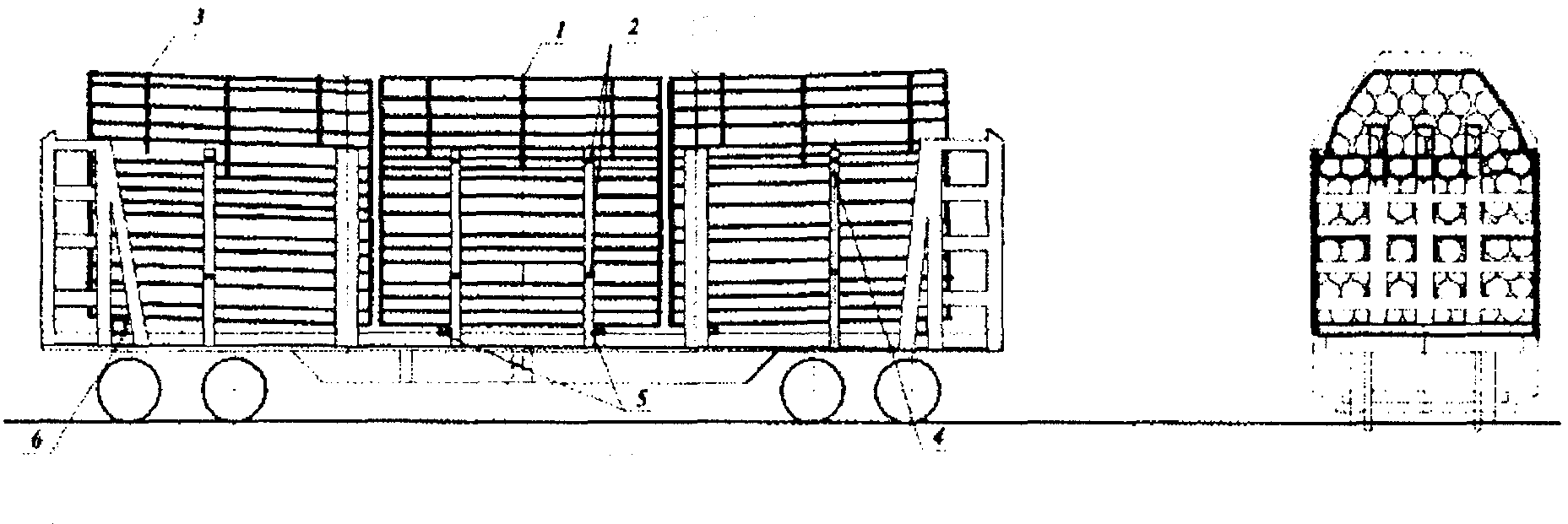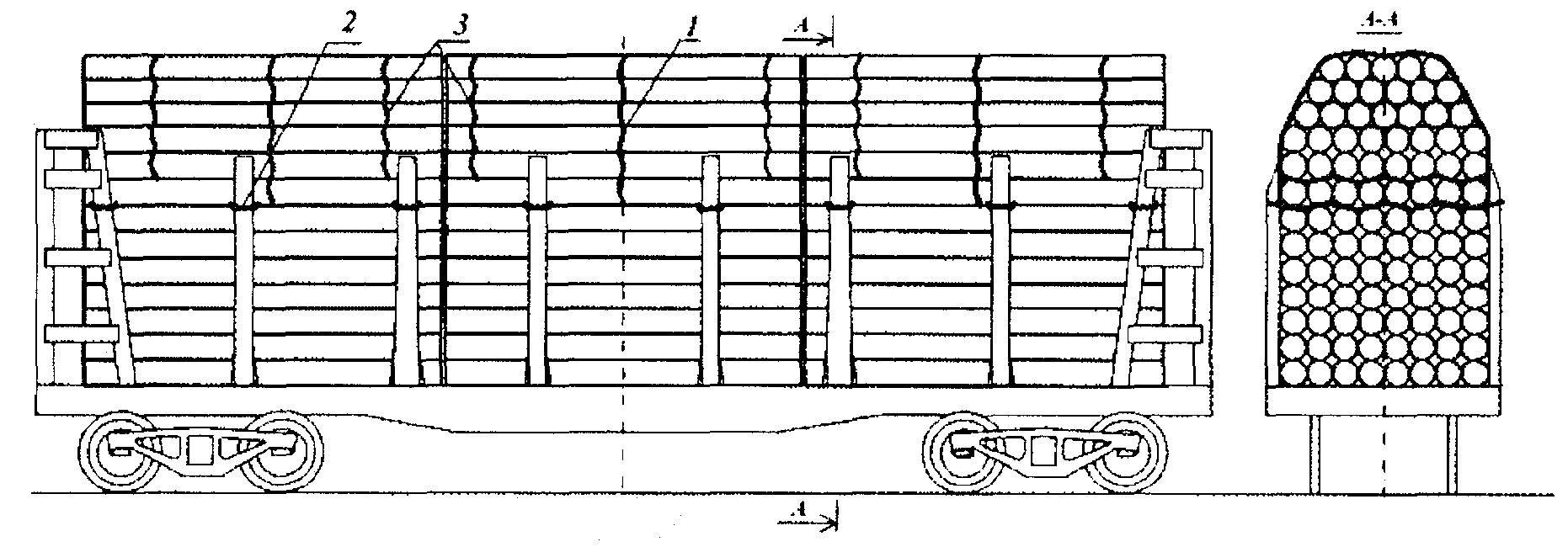 От продольного и поперечного смещения лесоматериалы, уложенные в "шапке" выше боковых стоек, закрепляются обвязками из проволоки диаметром 6 мм в четыре нити за устройства, расположенные на стационарной стойке вагона.