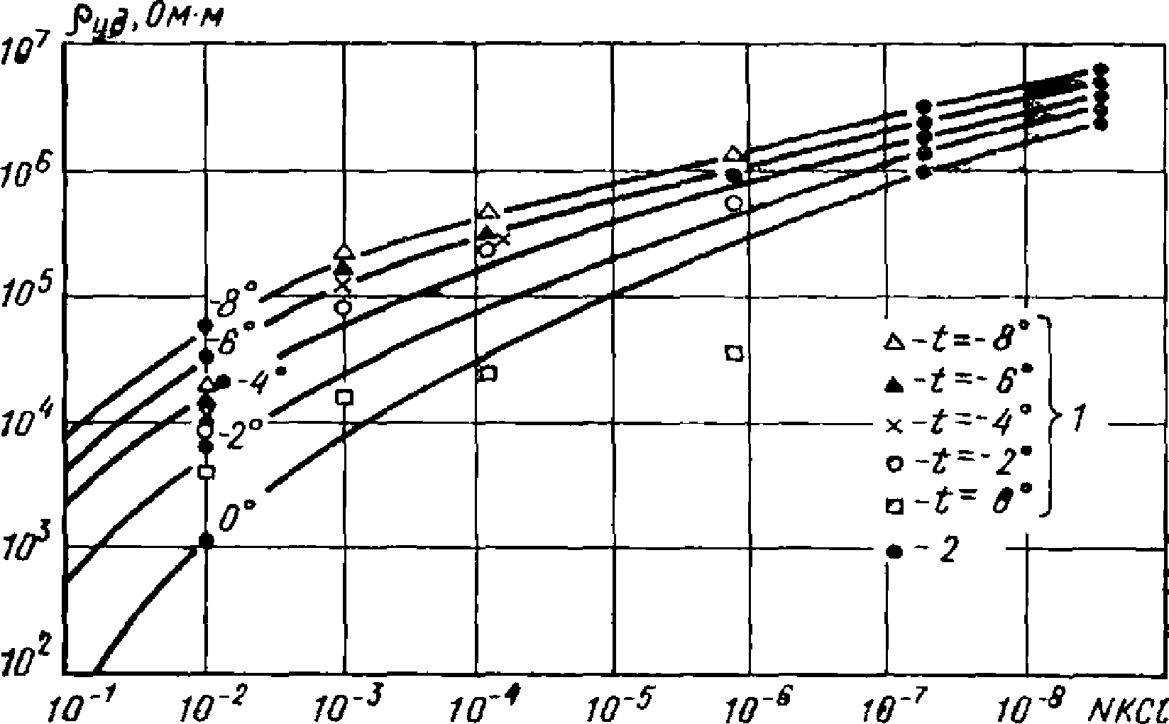 1.10. УЭС льда также зависит от концентрации (минерализации) замерзшего электролита и температуры. Характер этой зависимости показан на
