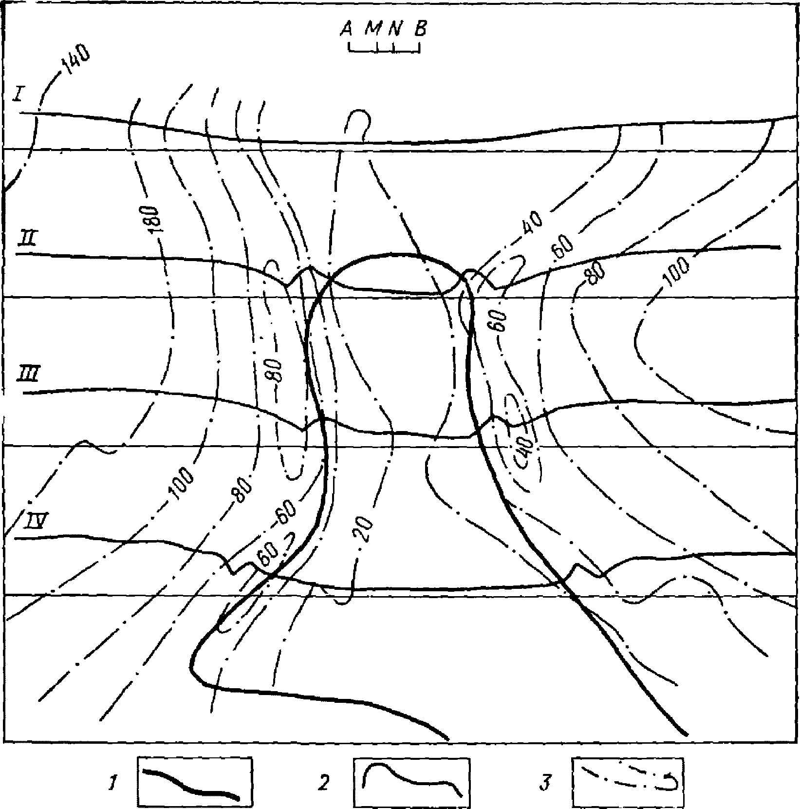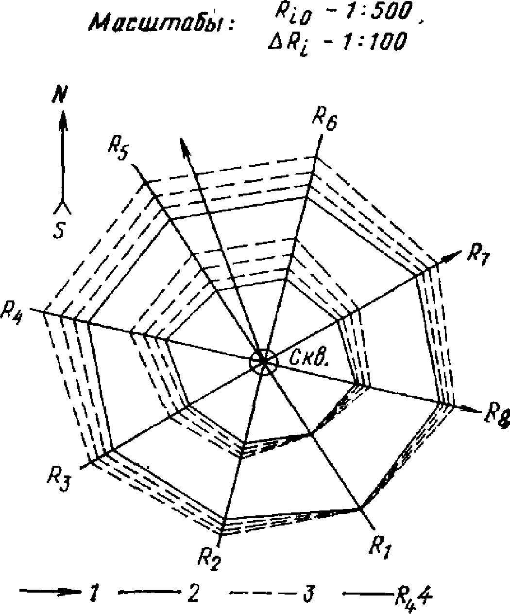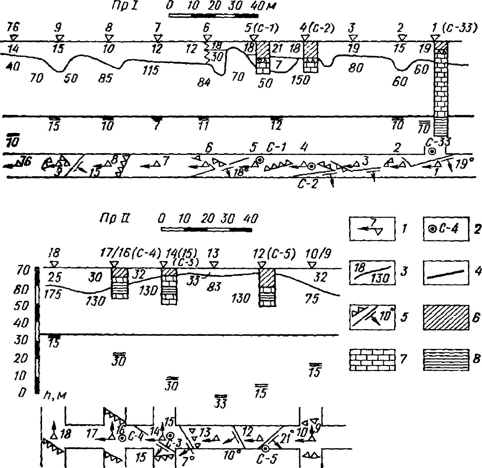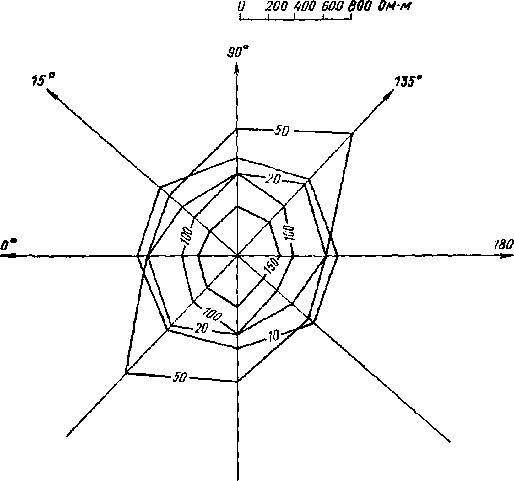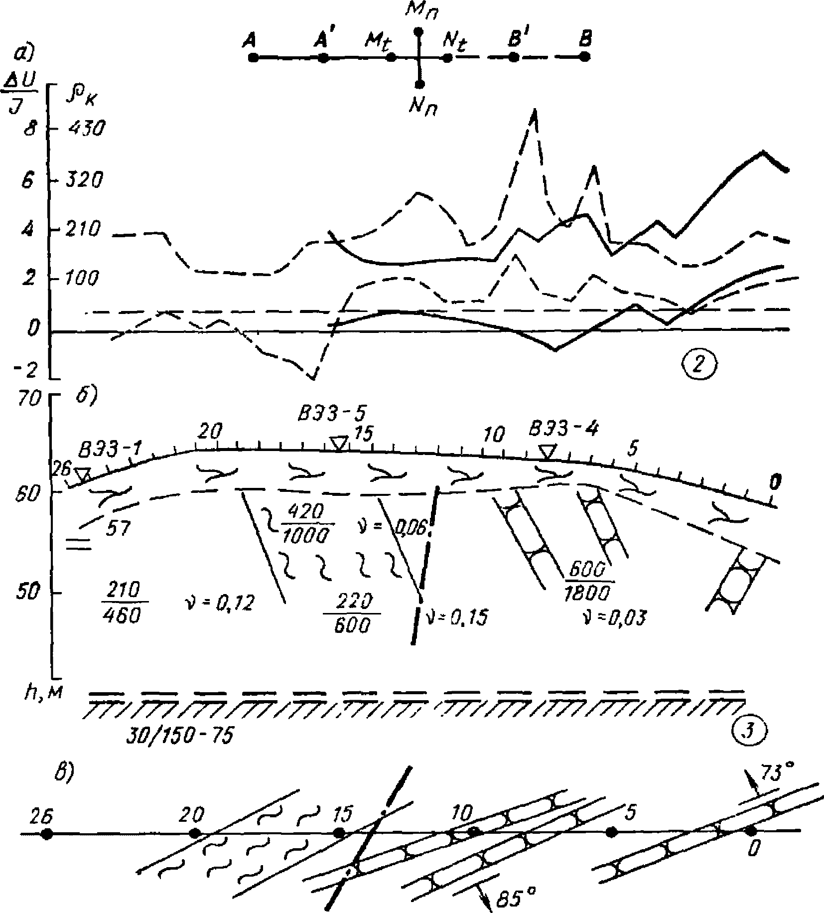 рис. 55) и план простирания геоэлектрических границ к нему. По совокупности полученных данных было предположено, что непроводящие пласты связаны с более массивными слоями пород (песчаниками). Зоны пониженного сопротивления были отнесены к более трещиноватым ослабленным пропласткам (аргиллитам и алевролитам). Высокие значения УЭС, не свойственные породам таврической серии, позволили сделать заключение об общей высокой трещиноватости и рассланцованности изучаемой толщи и ее низкой влажности на большую глубину. По имеющейся сети профилей была составлена корреляционная схема геоэлектрических аномалий, на которой были прослежены границы всех возмущающих объектов