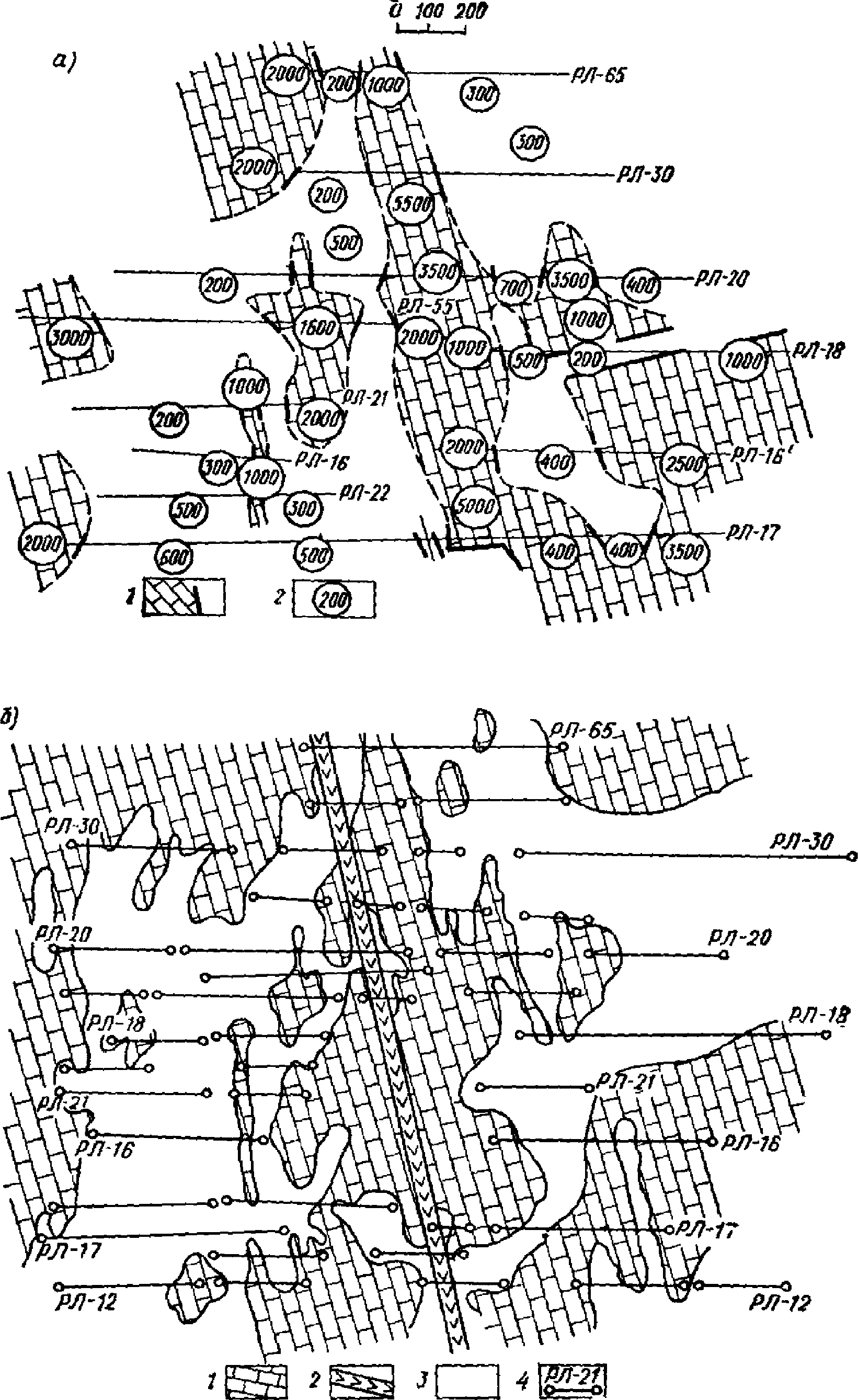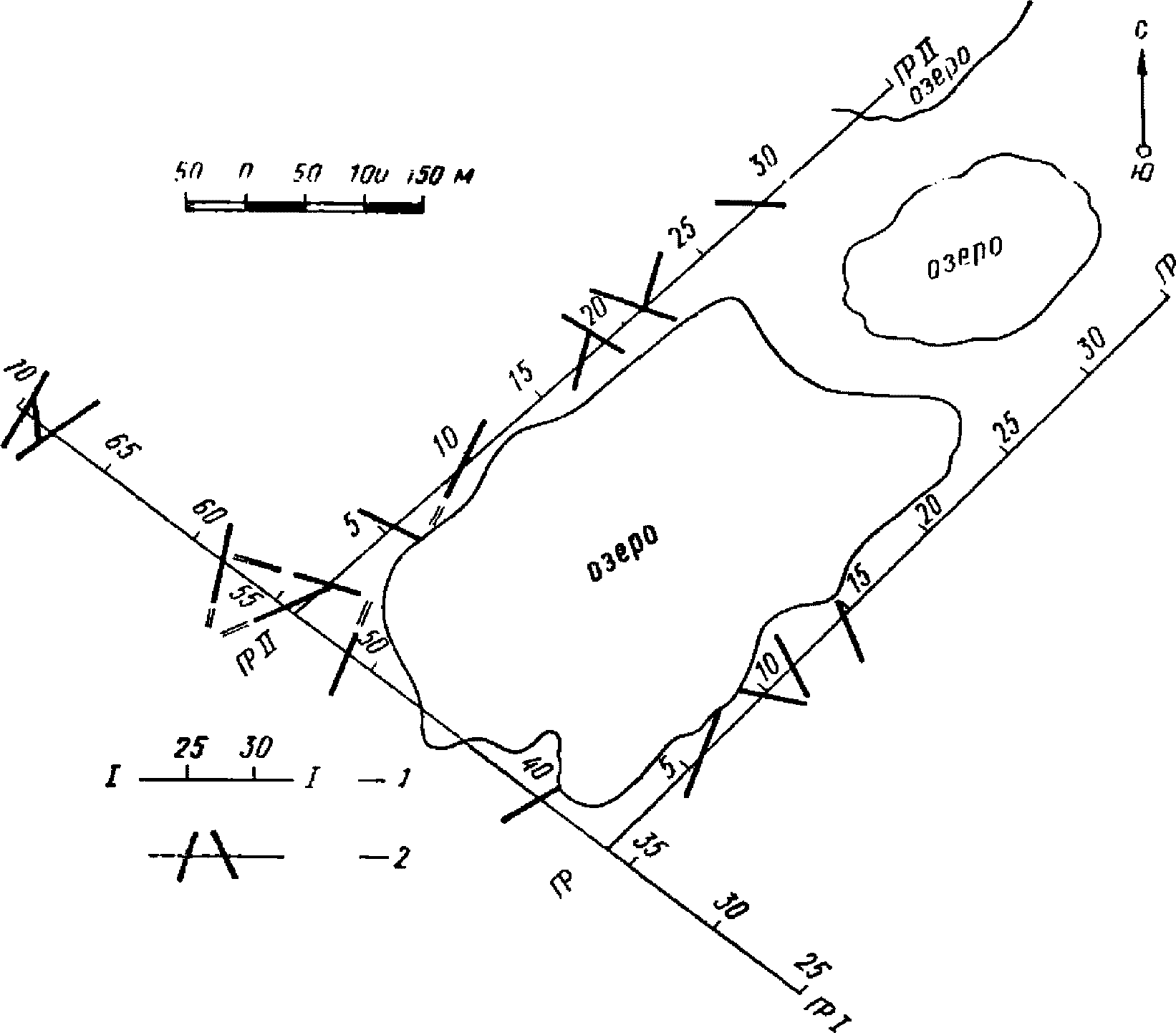 рис. 54). На ней отчетливо обрисовалась полигональная система жил. Для проверки полученных данных на пк. 54, 77, 78, 90 были пройдены шурфы. Все они вскрыли жилы льда, элементы залегания которых оказались в хорошем соответствии с результатами количественной интерпретации данных электропрофилирования и ВЭЗ (ошибка в оценке простирания не превышала +/- 5°). Глубины залегания жил, установленные с помощью ЭП МДС и ВЭЗ МДС, отвечают глубине выклинивания ледяных жил, характерной для данного района. Буровые скважины, пройденные впоследствии, полностью подтвердили геофизические данные.