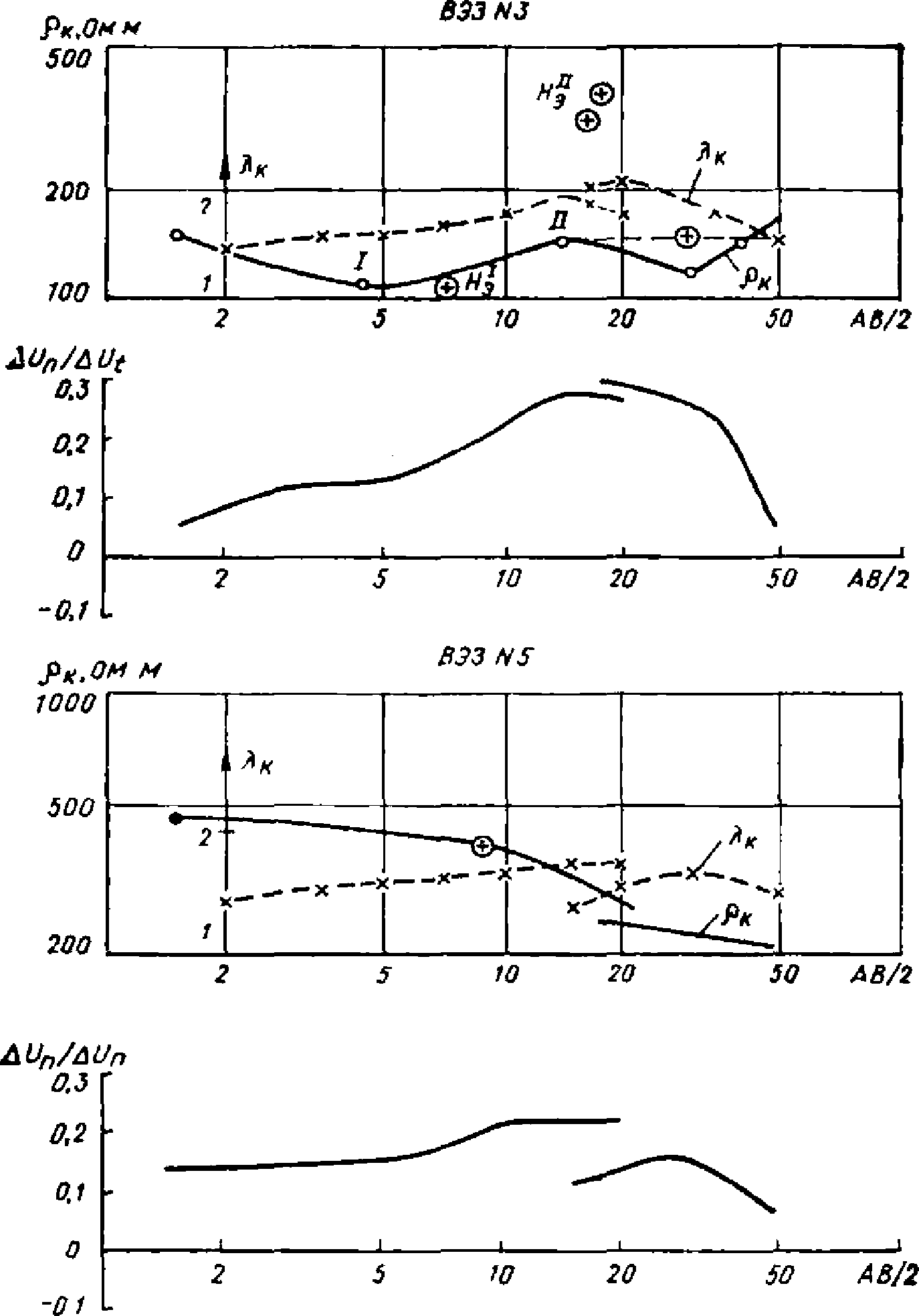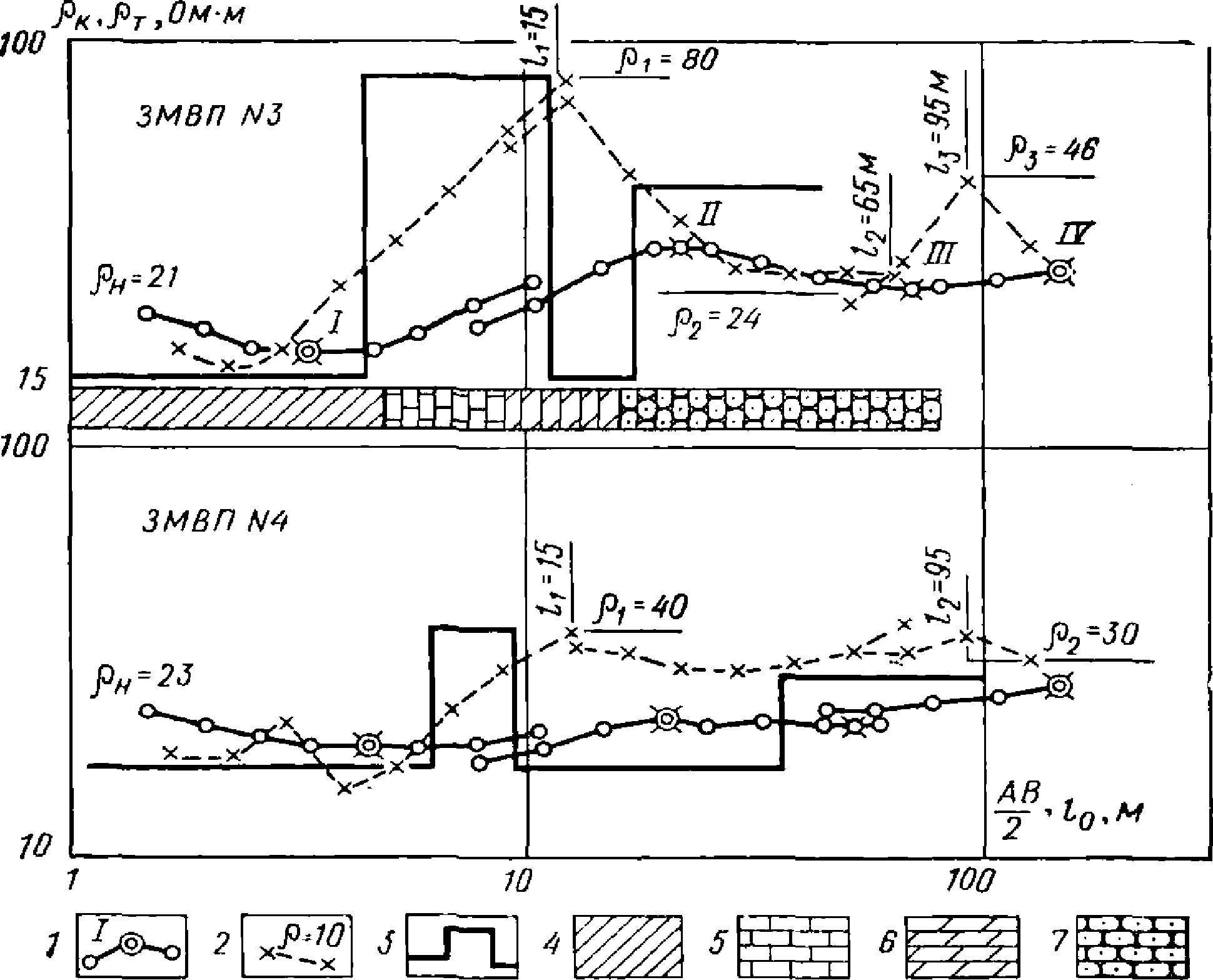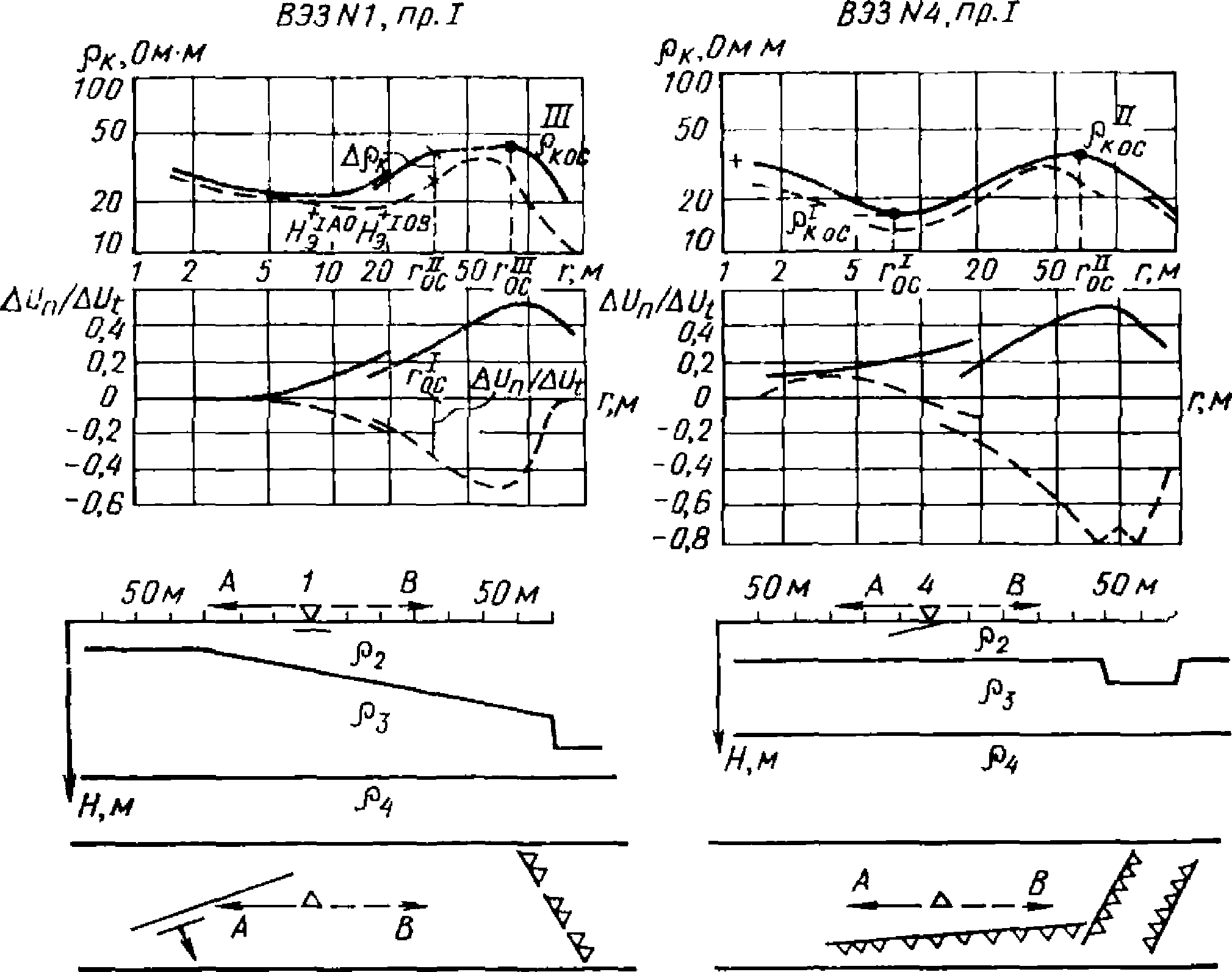 (рис. 58) позволяет установить трехслойное строение среды, осложненное ступенью в районе ВЭЗ N 4 и 5. Поэтому количественной интерпретации подвергались кривые, "реставрированные" на основании известных закономерностей изменения кривых