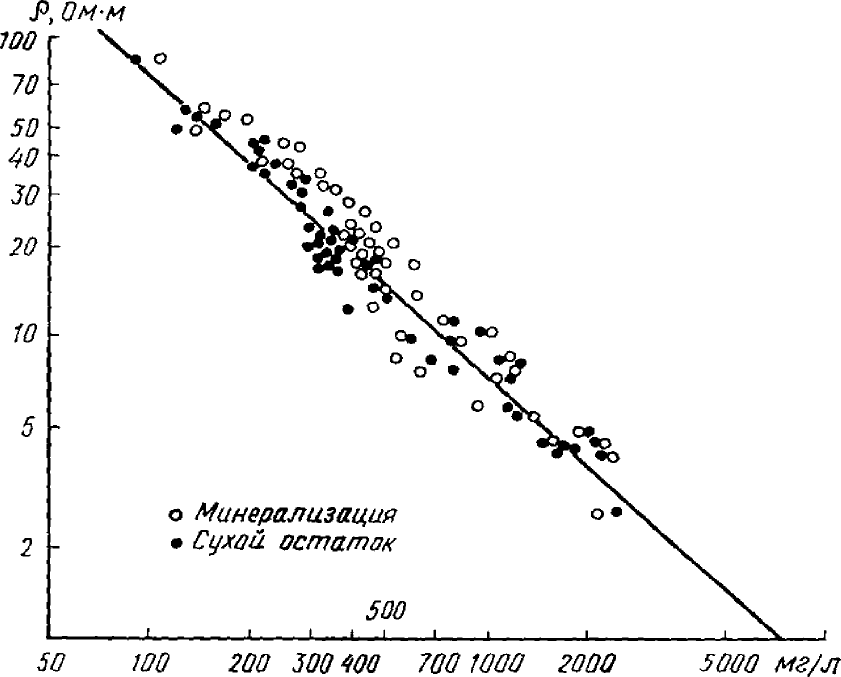 рис. 3 изображены зависимости удельного сопротивления водонасыщенных рыхлых пород от общей минерализации грунтовых вод. Они построены по результатам интерпретации кривых вертикальных электрических зондирований (ВЭЗ), выполненных вблизи скважин и шурфов.