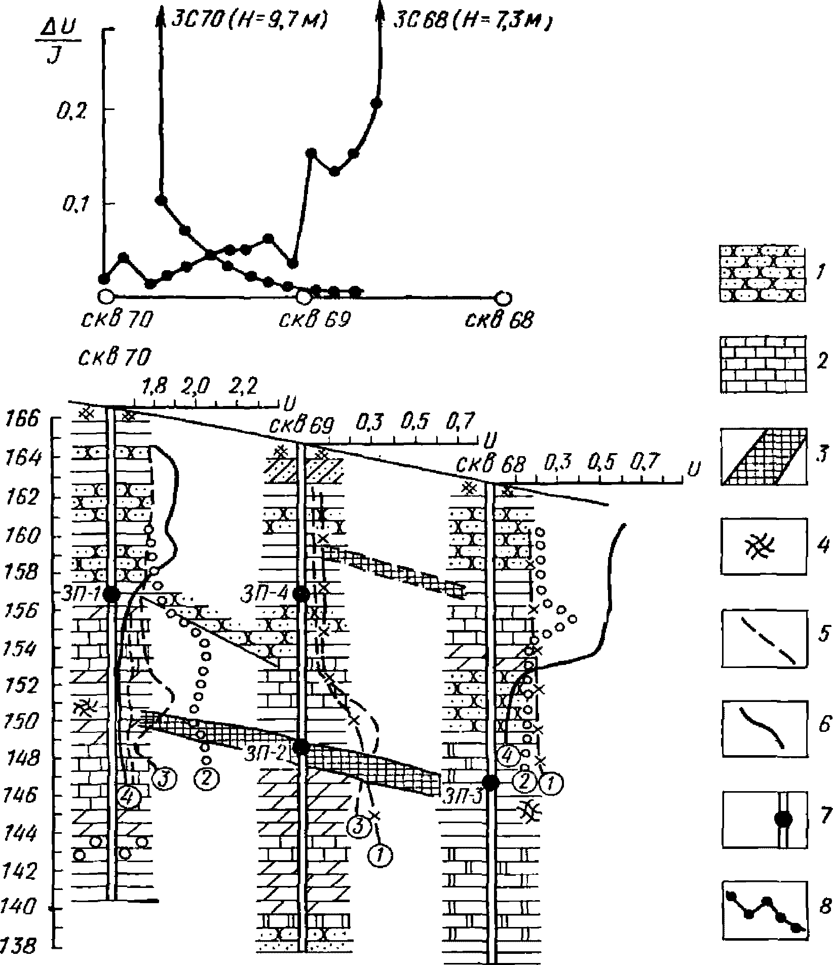 (рис. 59), на котором отчетливо выделились рыхлые отложения, трещиноватая зона в кровле карстующихся толщ и монолитные или слаботрещиноватые гипсы. Граница между трещиноватыми и монолитными гипсами наклонена по отношению к земной поверхности и образует уступ, который хорошо фиксируется по данным интерпретации кривых ВЭЗ. Пещера не выделилась на геоэлектрическом разрезе в силу слабой разрешающей способности последних по отношению к маломощным непроводящим телам. По данным гравиметрии (см.