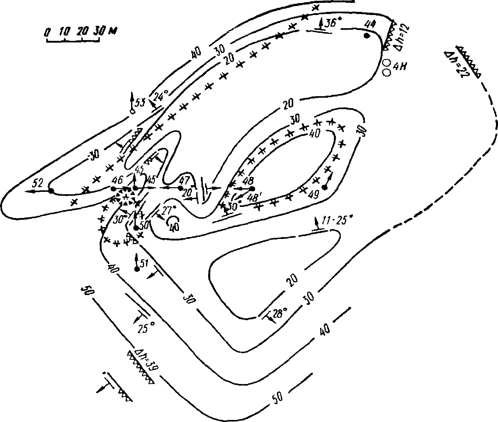 рис. 59) установлено, что пустота приурочена к уступу и залегает в кровле монолитных гипсов или в подошве разрушенных пород.