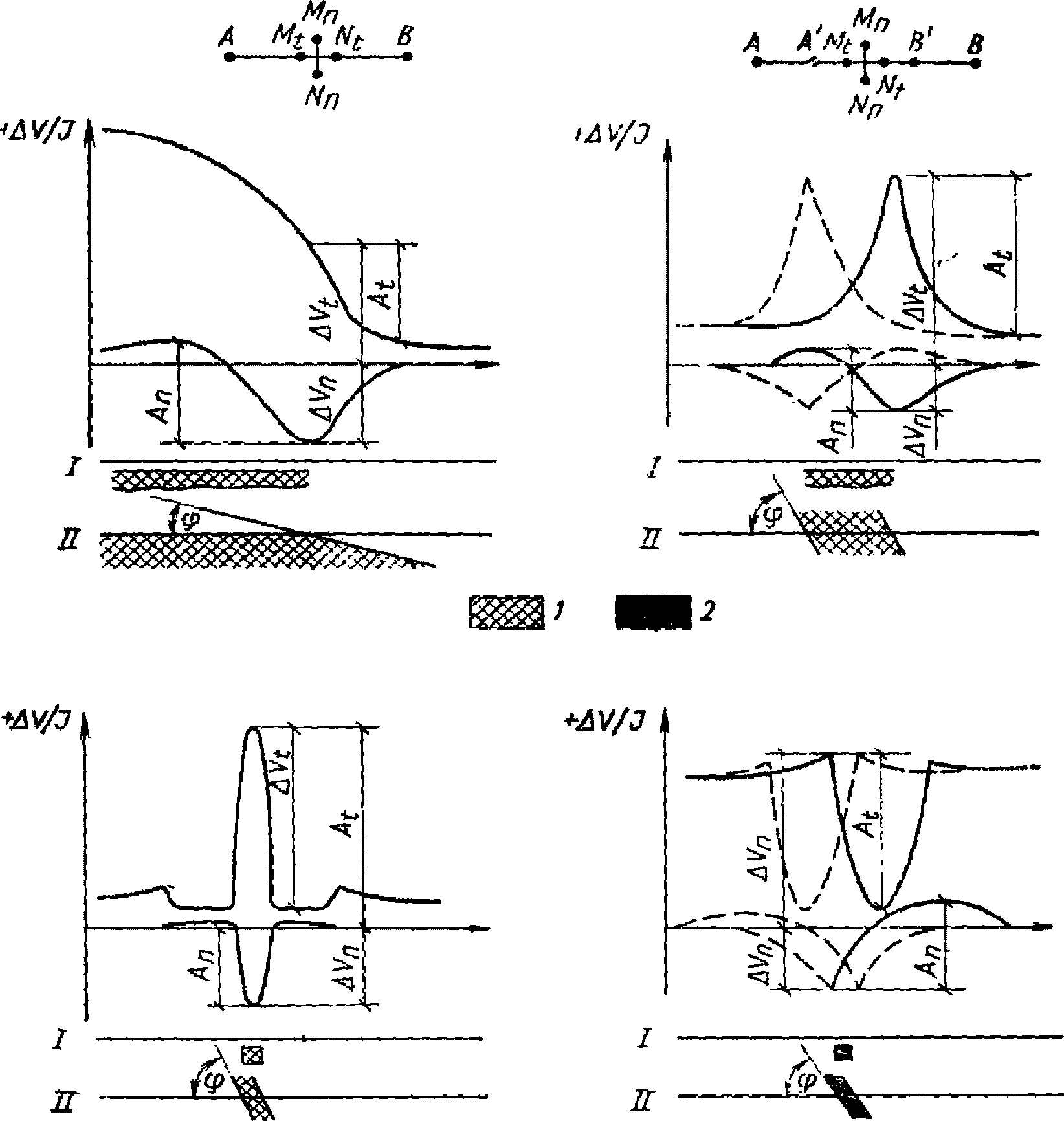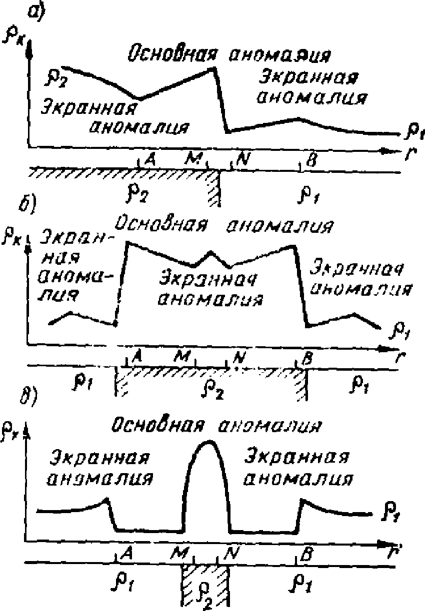 12.13. С увеличением мощности перекрывающих отложений эффективность любых видов электропрофилирования снижается и роль основных методов переходит к ВЭЗ МДС двусторонними трехэлектродными установками. Вспомогательные методы остаются теми же.