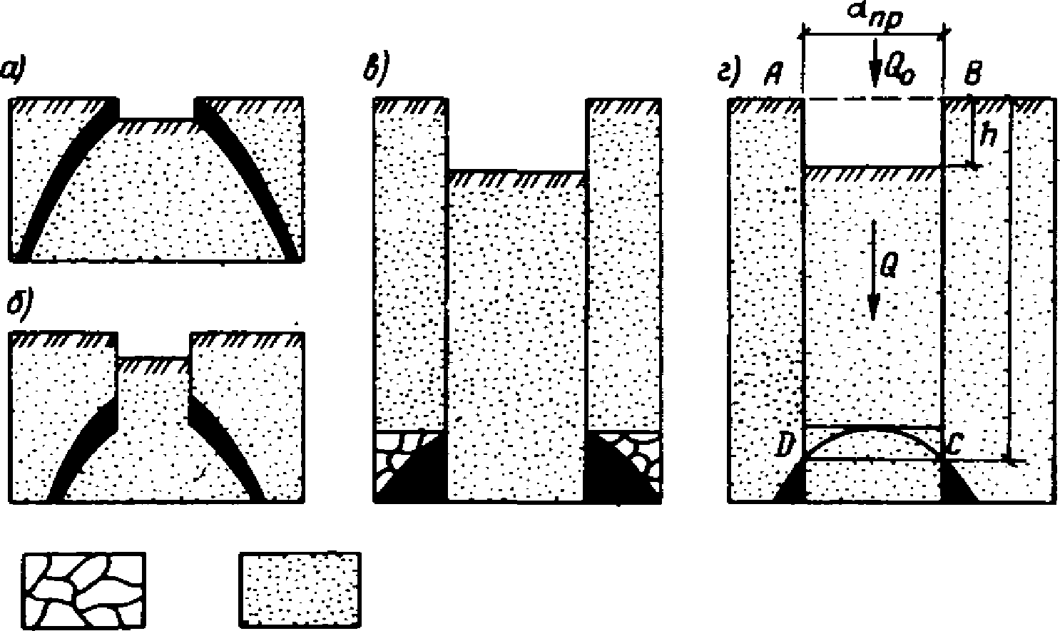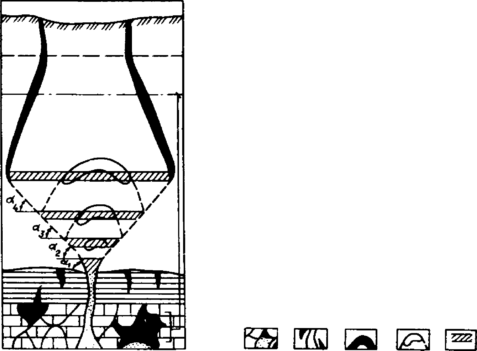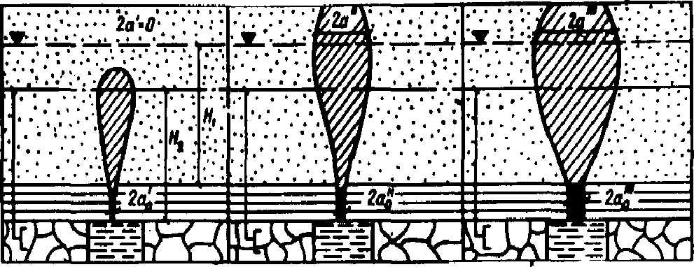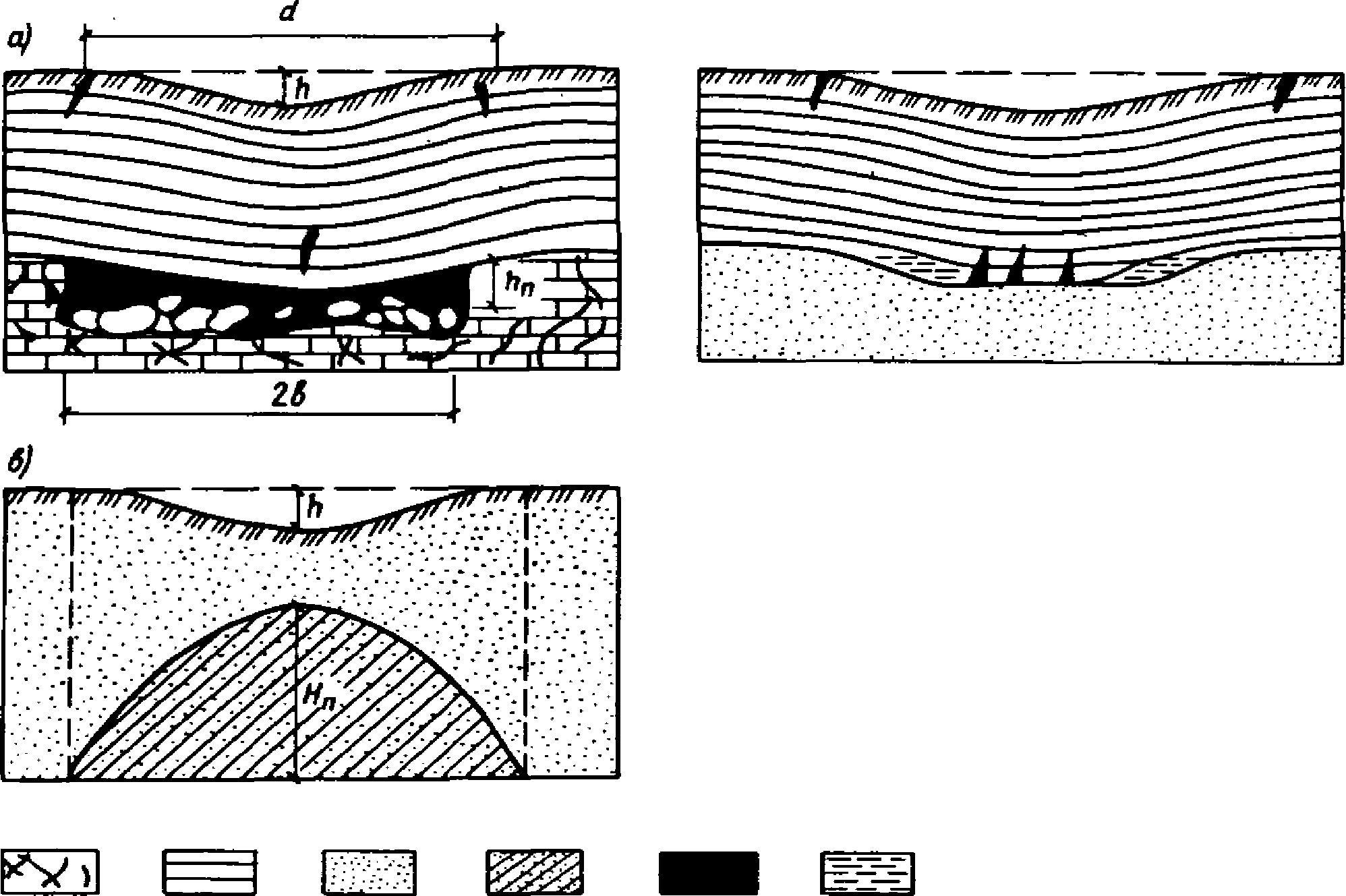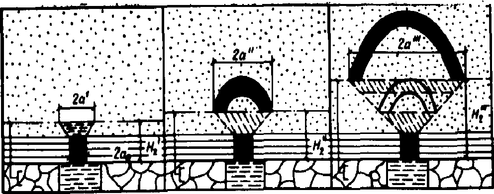 2.9. На очертания сводов в покровных нескальных грунтах оказывает влияние также время, в течение которого происходит расширение полости в их основании. При мгновенном расширении полости (обрушение кровли, выпадение отдельных блоков) своды в грунтах оказываются более крутыми, чем при медленном росте ширины полости.