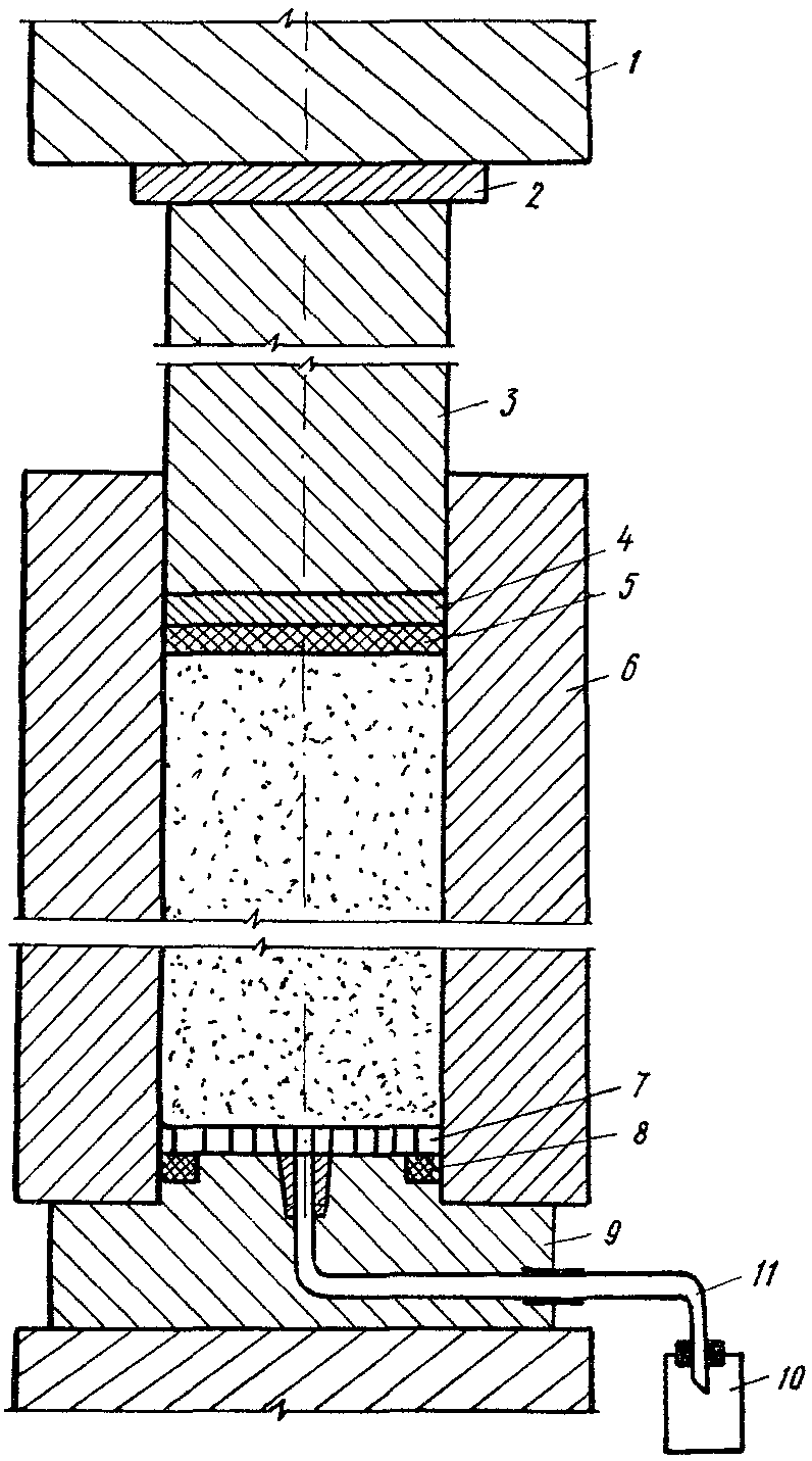 (рис. 1) состоит из трех частей: рабочего цилиндра (6), куда помещается проба грунта, поршня (3) и поддонника (9). В поддоннике выполнено отверстие диаметром 1,5 мм, по которому стекает раствор. В выходное отверстие поддонника вставляется игла-капилляр из нержавеющей стали, в качестве которой может быть использована игла к шприцам N 12150. Капилляр непосредственно соединяется с приемником раствора (10). Для герметичности между стенками цилиндра и поддонника помещается резиновая прокладка (8), над которой размещается пистон (7) - стальная круглая пластина с сеткой (отверстия диаметром 0,5 - 1 мм). Для уплотнения в верхней части пресс-формы, между поршнем и пробой грунта помещаются эбонитовый диск (4) и резиновая прокладка (5). Внешний диаметр цилиндра равен 80 мм, внутренний - 40 мм; высота цилиндра - 180 мм. Детали пресс-формы изготовляются из нержавеющей стали марки 1Х18Н9Т. Для уменьшения трения в процессе отжатия и облегчения извлечения образца грунт помещается в бумажный стакан (гильзу из кальки, пропитанной смесью вазелина с графитом). В качестве источников давления могут быть использованы гидравлические или винтовые прессы или автомобильные домкраты.