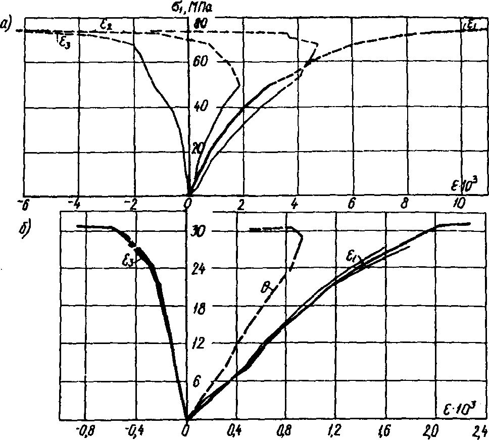 Таким образом, исследования двух- и трехосных напряженных состояний бетона при сжатии в широком интервале изменения главных напряжений, включая сложные нагружения, показали, что такие напряженные состояния обеспечивают достаточно высокую гарантию надежности бетона по прочности при условии сохранения данного напряженного состояния.