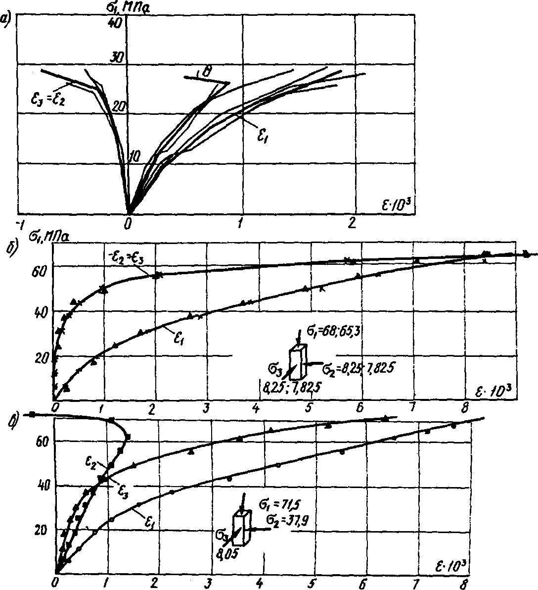 на образцах и преднапряженных балках (а) и при трехосном