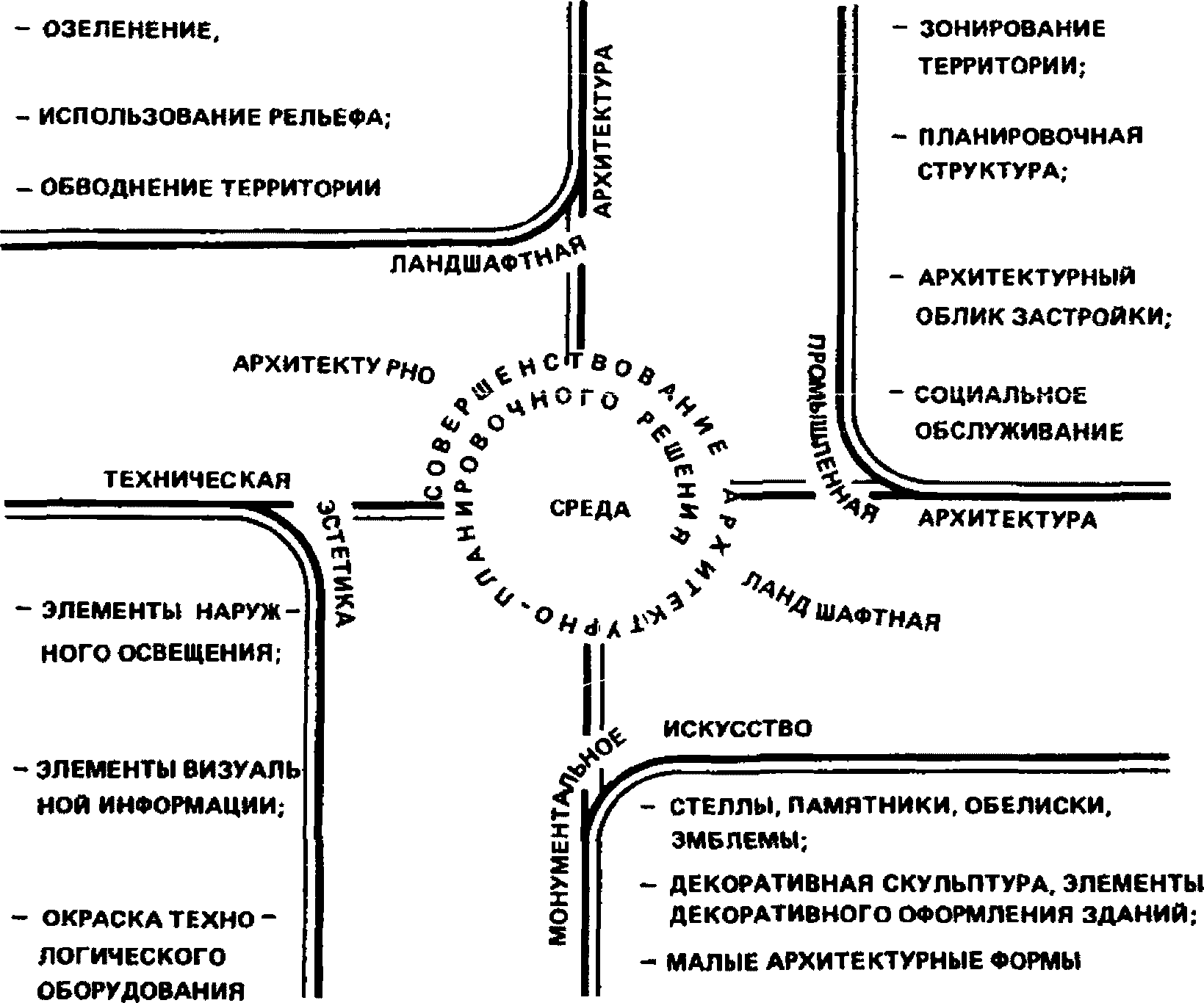 формирование единой системы приемов планировки, застройки и ландшафтной организации, обеспечивающей последовательность функциональных и пространственных связей "селитьба - предприятие";