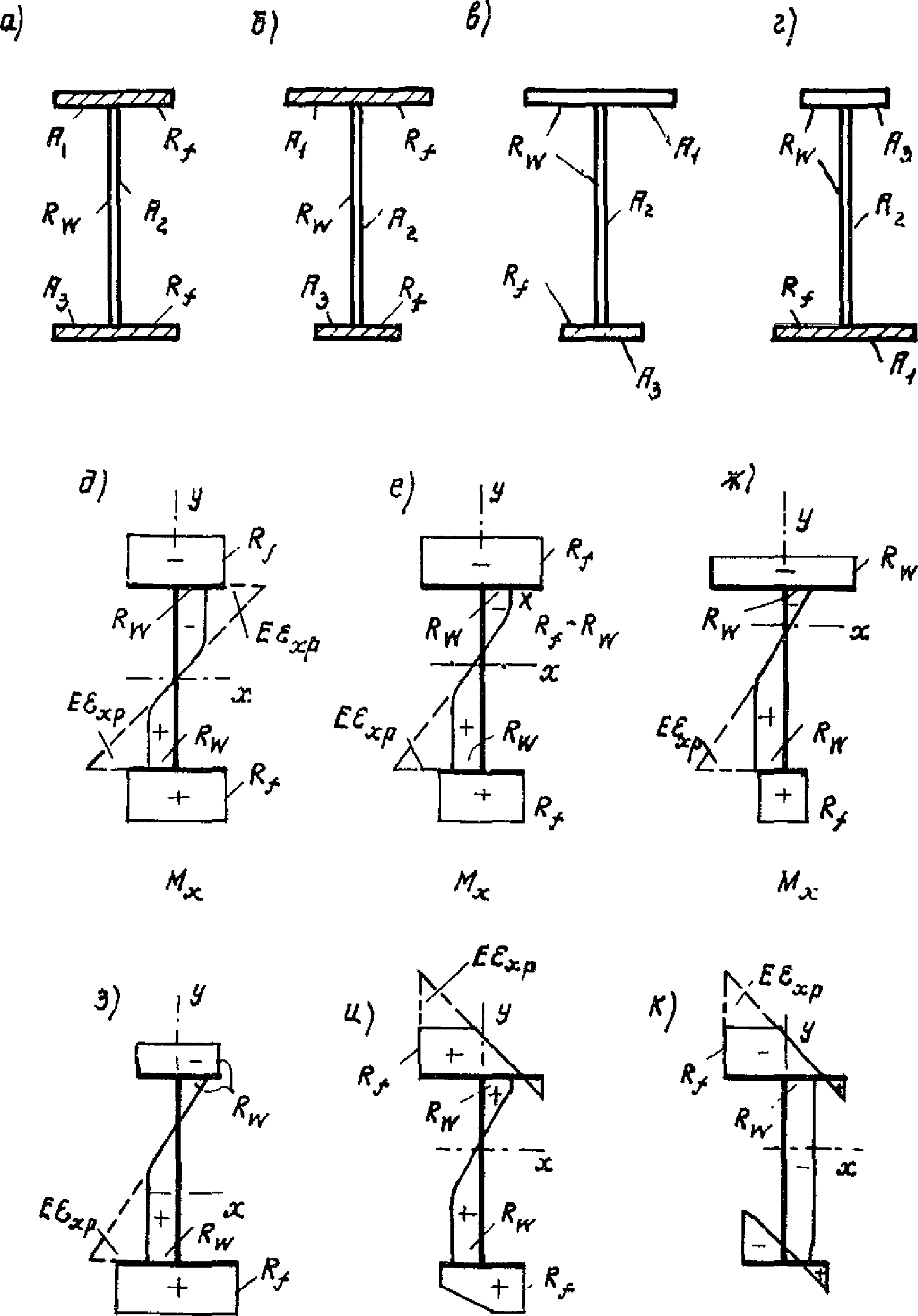 1.7. При упругопластическом расчете бистальных балок пределы текучести сталей поясов и стенки принимаются равными их расчетным сопротивлениям