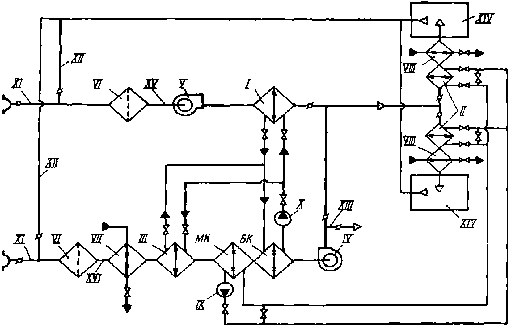 XII - рециркуляционный воздух; XIII - выброс в атмосферу;