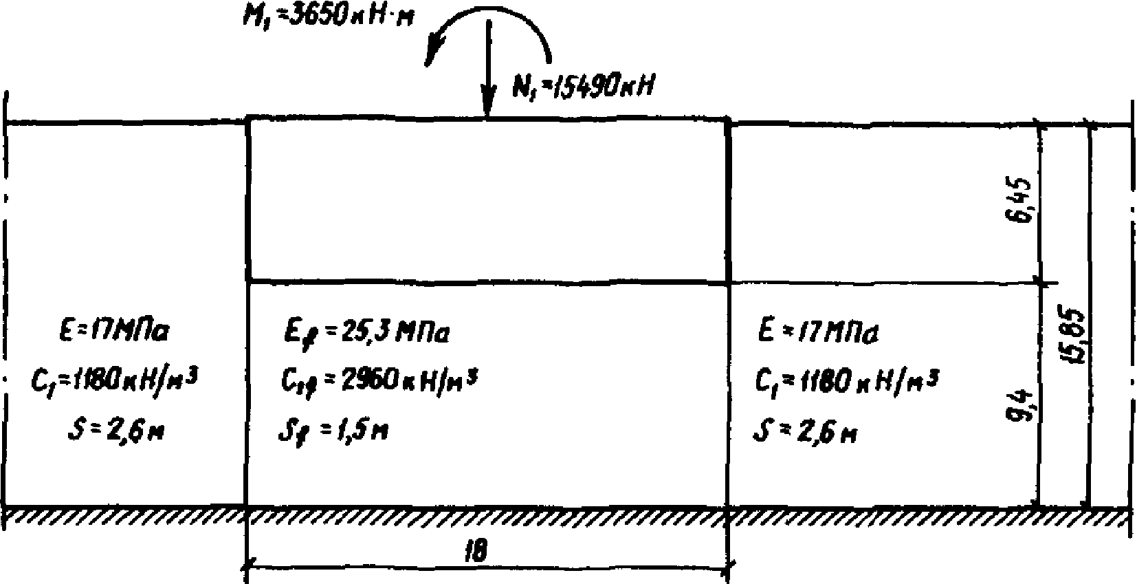 1 - постоянные нагрузки от собственного веса конструкций фундамента и временные длительные нагрузки от веса оборудования и бокового давления грунта, что соответствует фазе эксплуатации существующего фундамента;