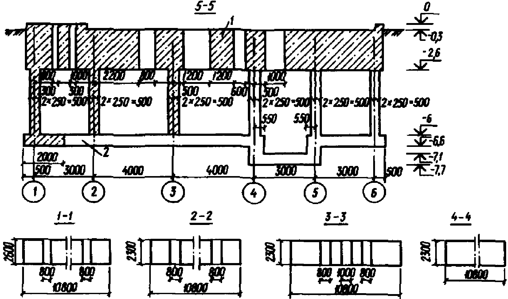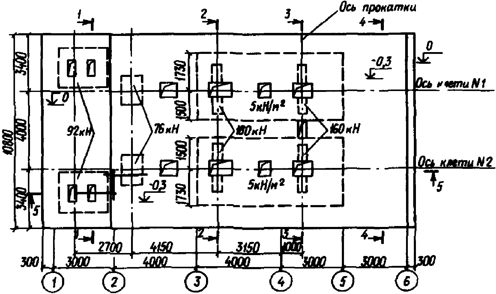3 - постоянные нагрузки от собственного веса конструкций фундамента и кратковременные нагрузки от веса оборудования; боковое давление грунта не учитывается, что соответствует фазе работы фундаментов в процессе выемки грунта в осях 1,6 и демонтажа оборудования.