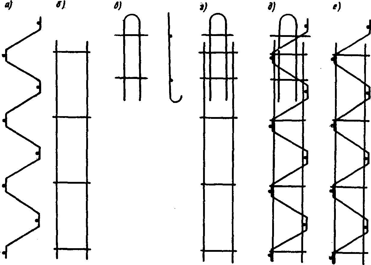 рис. 2, б) поперечные волнообразно изогнутые стержни не следует учитывать как поперечную арматуру. Для таких конструкций в случае недостаточной прочности расчетного наклонного сечения в арматурный каркас следует вводить дополнительные прямые поперечные стержни в виде плоских каркасов. Поперечные плоские каркасы в волнообразной сетке следует размещать согласно рекомендациям, приведенным в