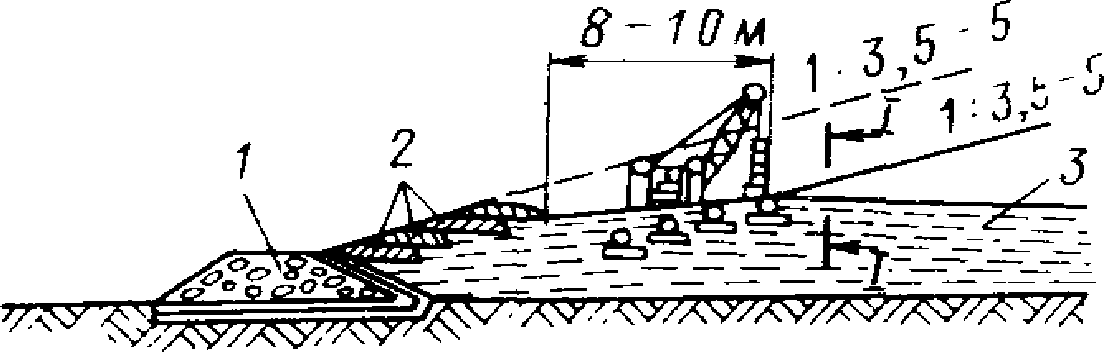 е) участки разрушенного волнами крепления верхового откоса дамб и плотин засыпаются крупным камнем; если разрушением затронуто тело сооружения, то предварительно отсыпается подготовка из гравия или щебня;