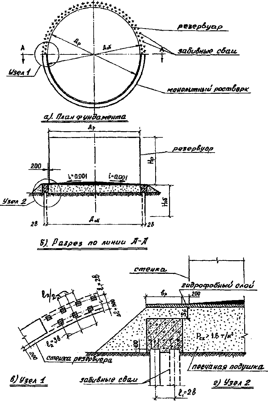 3.2. Конструкция кольцевого свайного фундамента должна включать не менее двух рядов забивных железобетонных свай, погруженных по периметру резервуара и объединенных поверху железобетонным монолитным ростверком (рис. 1 а, б).