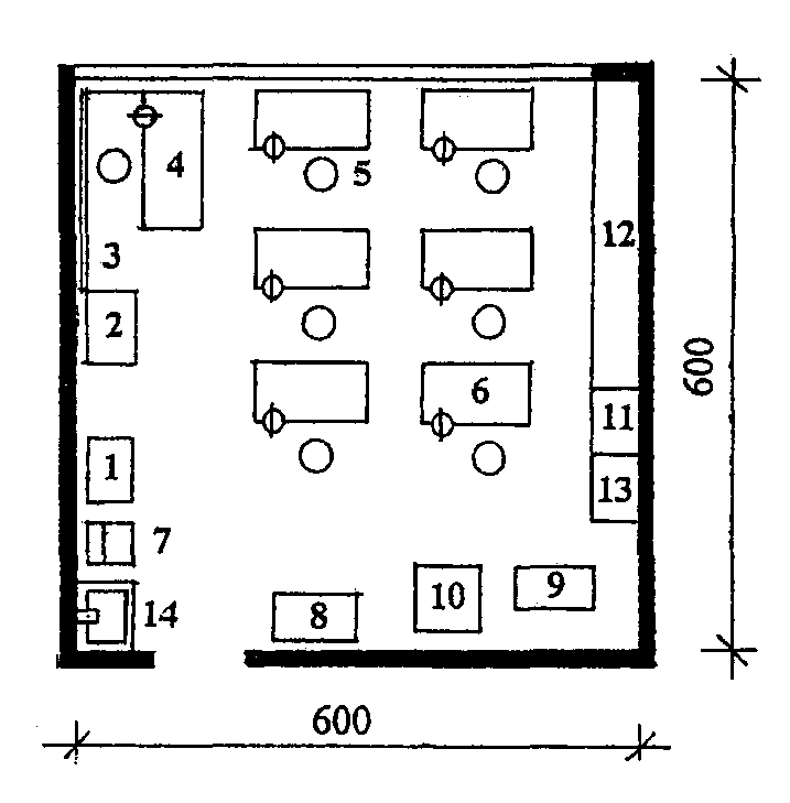 1 - шкаф для книг и пособий; 2 - муфельная печь; 3 - доска классная; 4 - верстак руководителя; 5 - табурет; 6 - верстак слесарный; 7 - точило наждачное; 8 - наковальня; 9 - станок токарный; 10 - станок сверлильный; 11 - встроенный шкаф для спецодежды; 12 - шкаф-стеллаж для инструментов и материалов; 13 - урна для мусора; 14 - раковина