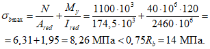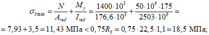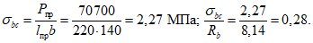 Расчетные сопротивления бетона с учетом коэффициентов условий его работы и отпускной прочности, равной 0,7 Rb, составляют: