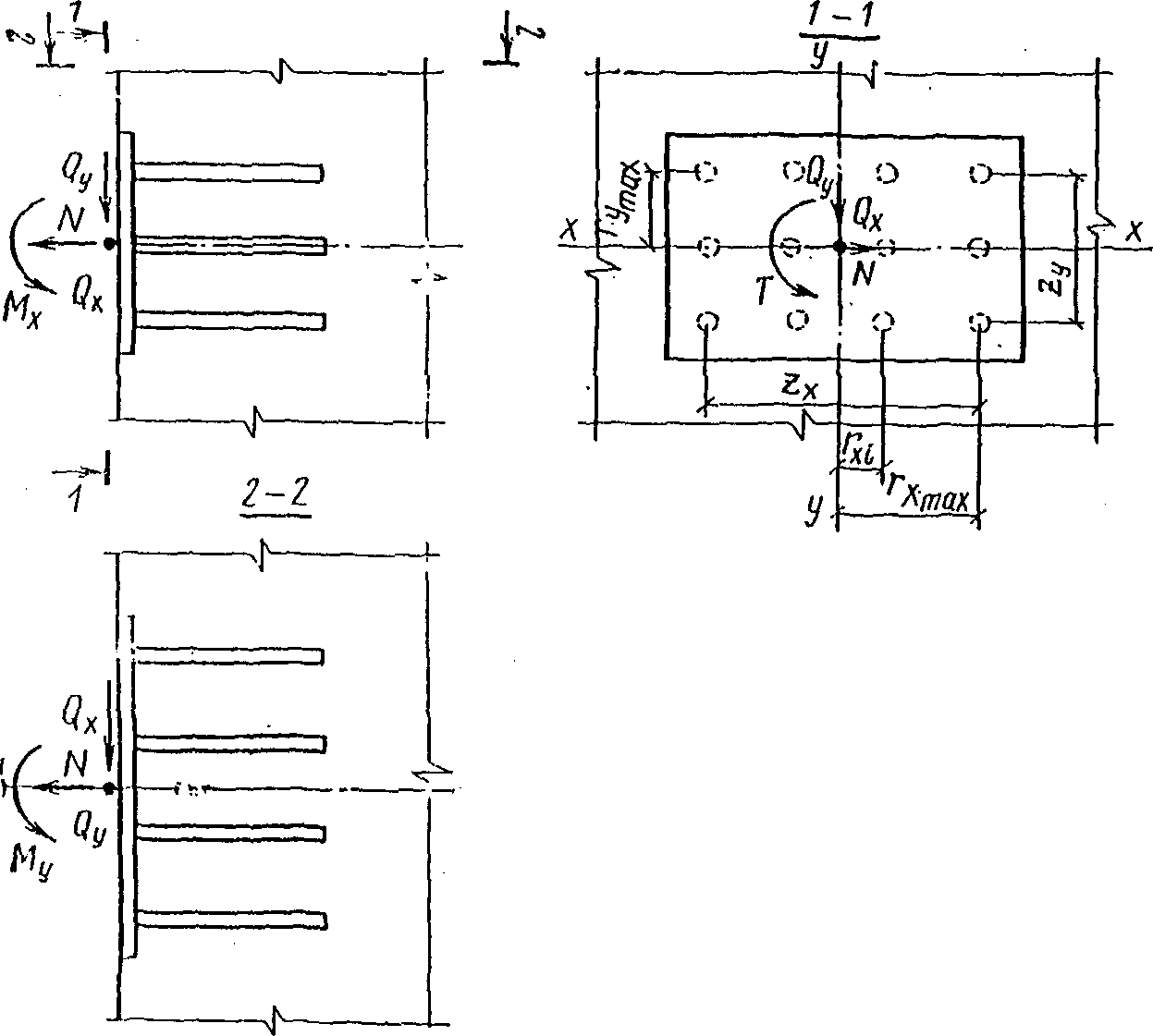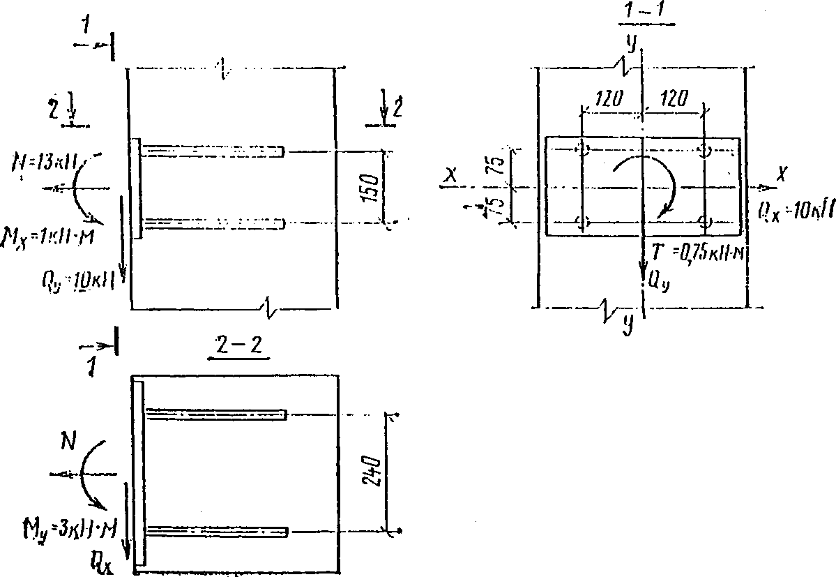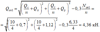 Qx и Qy | - | сдвигающие силы, действующие соответственно вдоль осей x и y, находящихся в плоскости наружной грани пластины и проходящих через центр тяжести нормальных анкеров в направлении осей ее симметрии; |