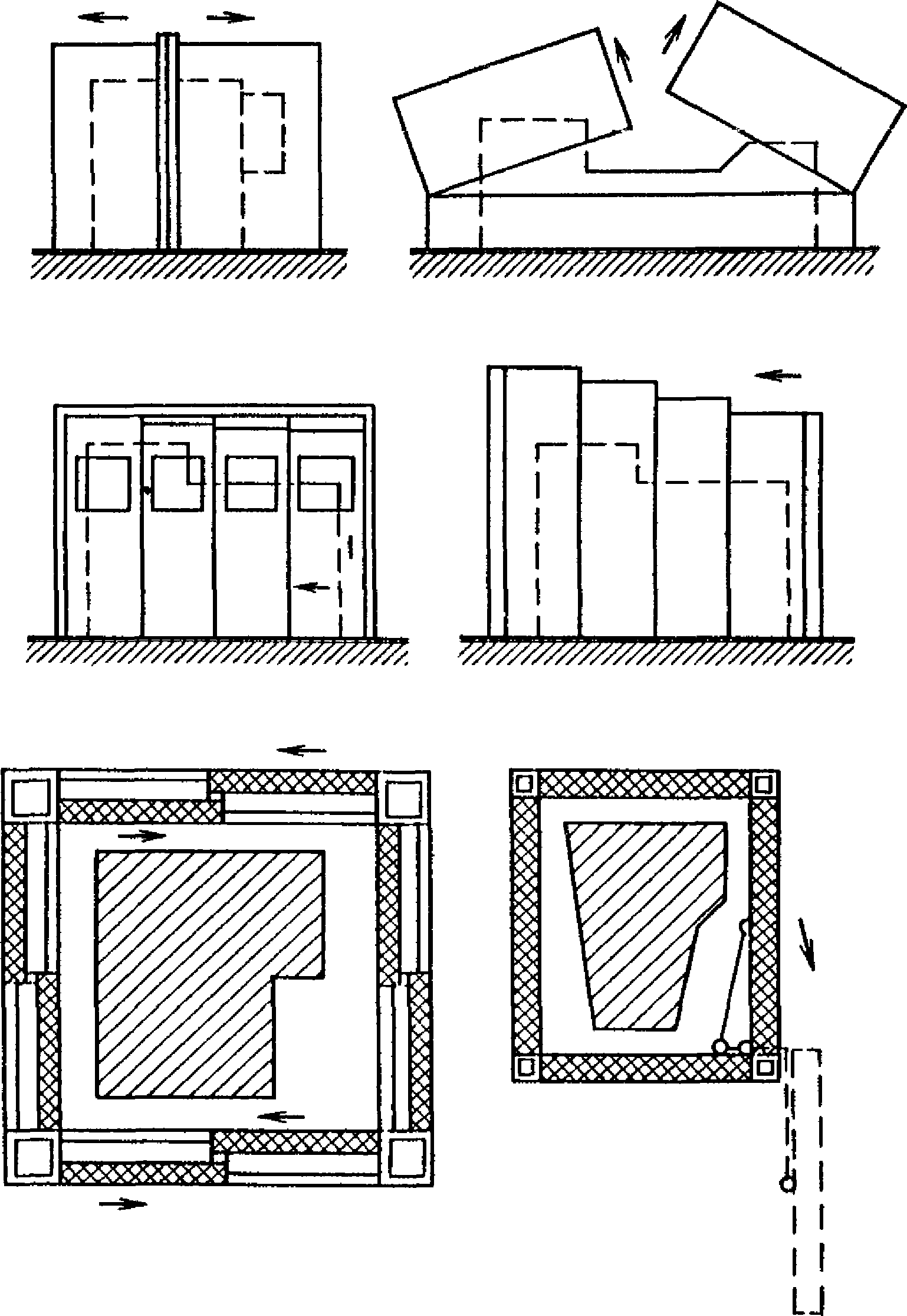 Конструкция технологических отверстий определяется конкретными условиями эксплуатации, однако звукоизоляция отверстий должна быть сравнима со звукоизоляцией элементов ограждения. В случае непрерывной подачи сырья и получения готовой продукции целесообразно использовать акустически обработанные туннели. Отдельные предметы можно пропускать через самоуплотняющиеся отверстия, например с гибкими складными дверьми. Для пропуска мелких предметов и диспергированной среды целесообразно использование накопительных емкостей (загрузочных бункеров, ковшов). В этом случае шум будет излучаться только в течение коротких отрезков времени.
