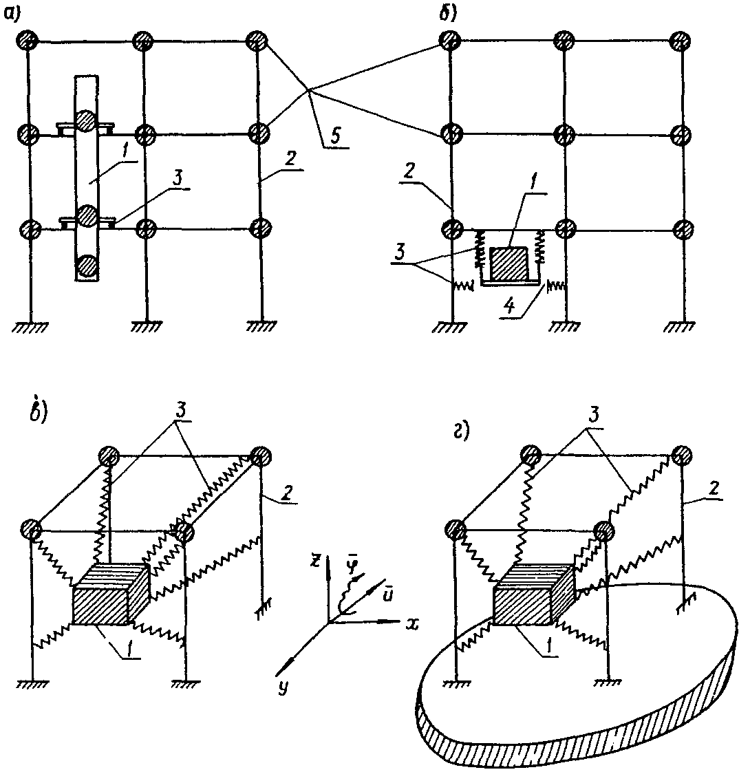 Схема, показанная на рис. 2, г, используется для расчета сооружений при большом соотношении массы несущих конструкций и подвешенной массы (примерно равным 1). В этом случае целесообразно применять модели, учитывающие пространственный характер движения масс и сейсмического воздействия. Схема (рис. 2, г) относится к классу упруго-гравитационных систем, движение масс которых определяется восстанавливающими силами упругого и гравитационного силовых полей.