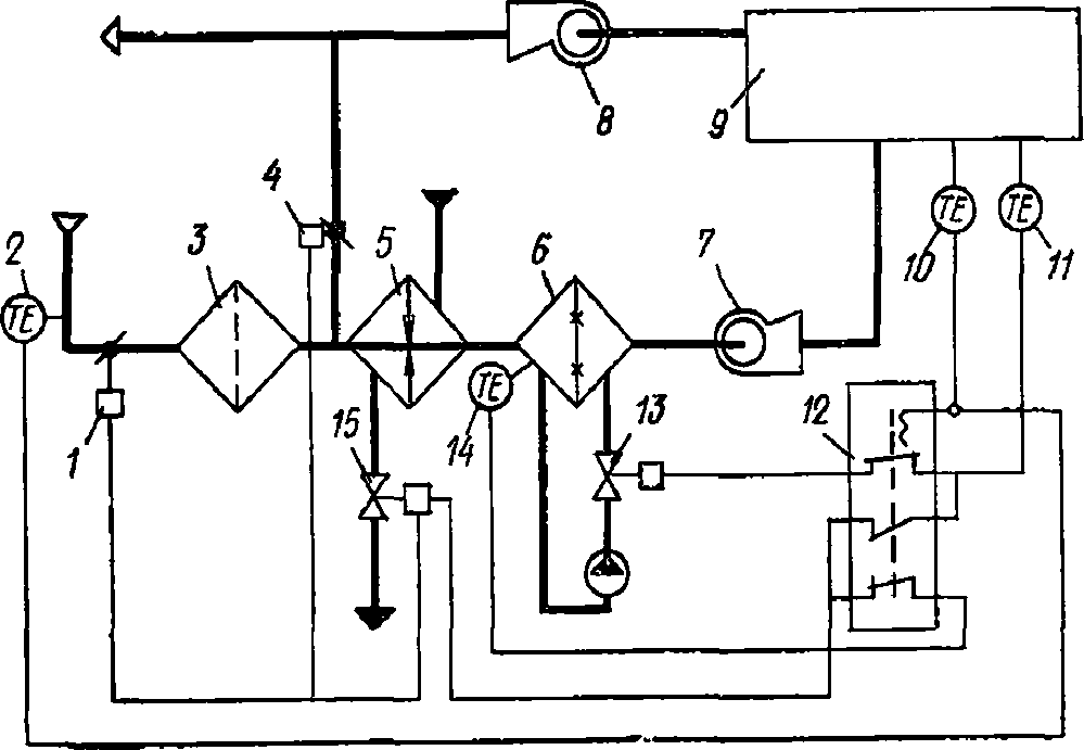 п. 3.4), воздействующие на устройства, изменяющие расход теплоносителя в теплообменнике первого подогрева или соотношение в смеси наружного и рециркуляционного воздуха.