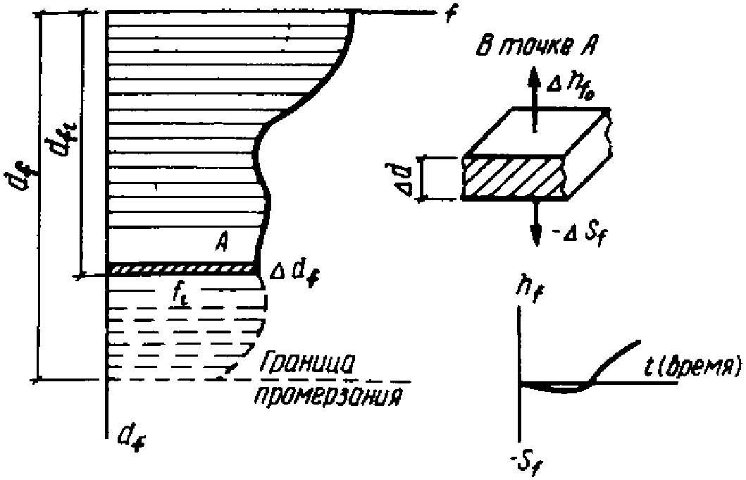 Значение f представляет собой дифференцированную по глубине пучащегося слоя алгебраическую сумму деформаций грунта за счет перемещения его вверх по нормали к фронту промерзания (деформация пучения