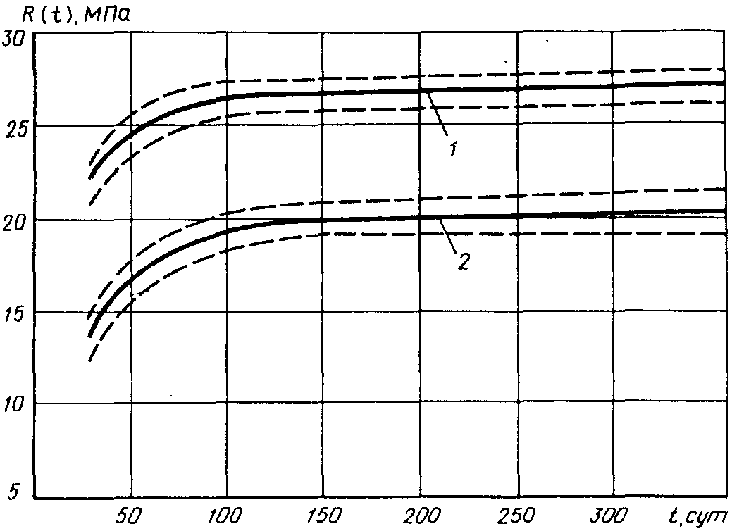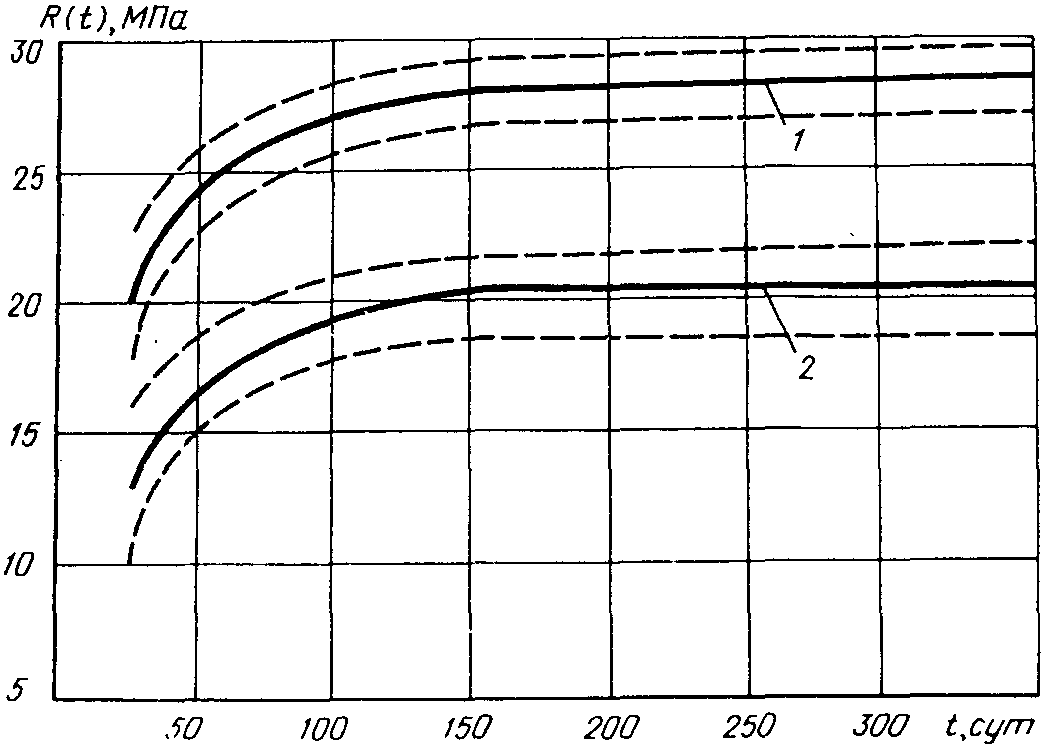 2.5. В качестве дополнительного эксплуатационного требования рекомендуется принимать срок начала эксплуатации конструктивных элементов t, учет которого на стадии проектирования составов позволяет получать бетоны, гарантирующие нормативный уровень основных эксплуатационных требований к началу эксплуатации элемента. Возможность такого подхода связана с особенностями изменения во времени прочностных и деформативных свойств применяемого керамзитобетона и может быть дополнительным источником экономии материальных ресурсов.