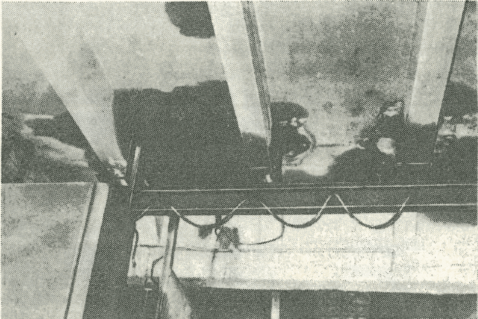 5. Определить степень повреждения и место наибольшего разрушения арматуры, находящейся в закрытых каналах, и устранить дефекты инъецирования, не представлялось возможным. Поэтому было принято решение об усилении всех 17 подстропильных балок, в которых имеются признаки коррозионного разрушения арматуры. За остальными балками установили систематическое наблюдение, а нижние полки и приопорные участки были покрыты антикоррозионным покрытием.