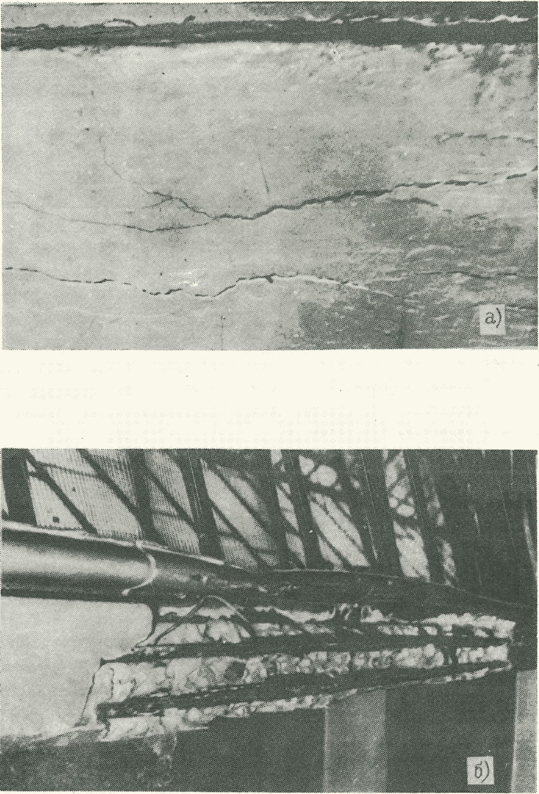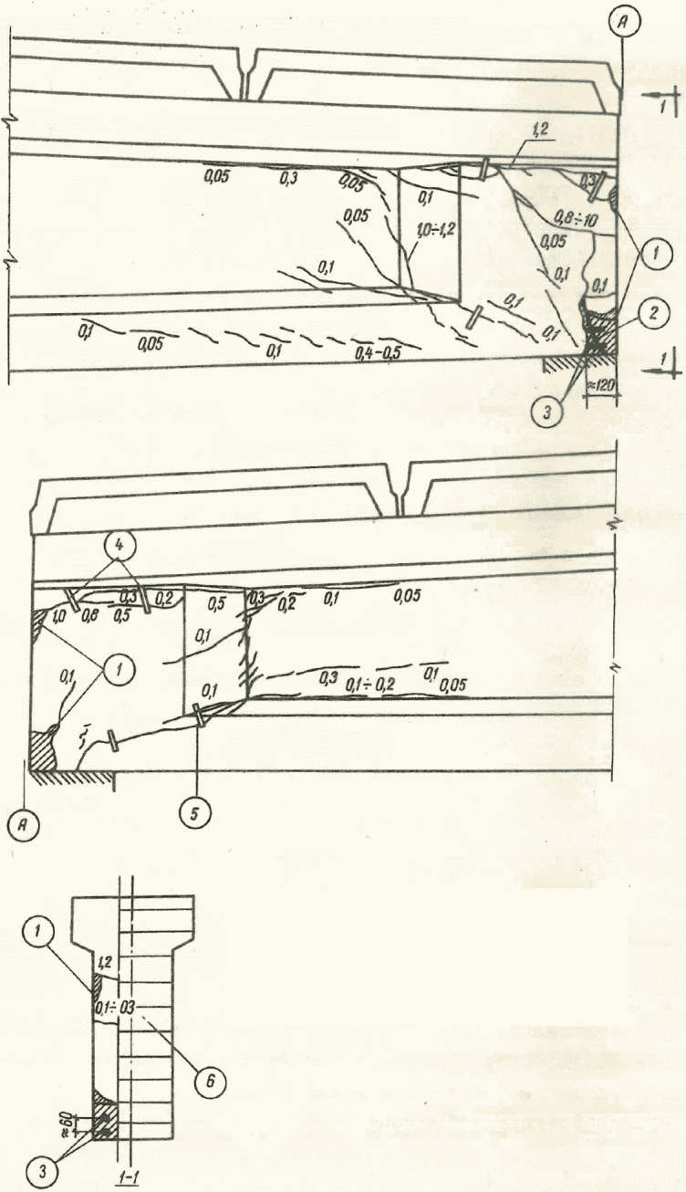 б) наличие трещин в бетоне - трещины сдвига, лещадки и трещины раздробления бетона в сжатых элементах, недопустимая по нормам величина раскрытия трещин от главных растягивающих напряжений; трещины, пересекающие зону анкеровки растянутой арматуры и трещины от сдвига арматуры в опорных узлах и проч.;