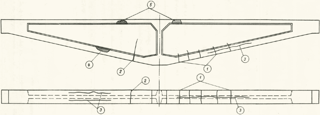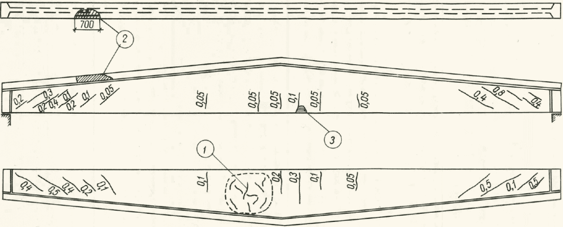 (рис. 13). Состояние каждой из 48 балок отражено в табличной ведомости, где перечислены (со ссылкой на схему) дефекты, данные по контрольному замеру основных сечений, прочность бетона приопорных участков и верхней полки средней части пролета. Обследование показало: