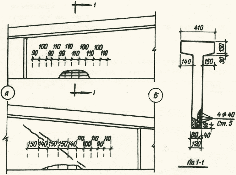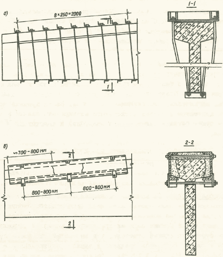 2) Участок верхней полки на длине поврежденного свеса следует отремонтировать обоймой из двух швеллеров, охватывающих полку по бокам, с тщательным пробетонированием полости между ними (