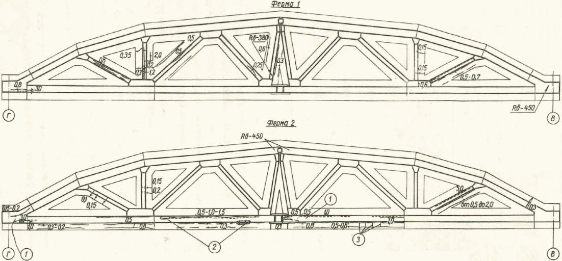 1 - подстропильная балка; 2 - стропильная ферма;