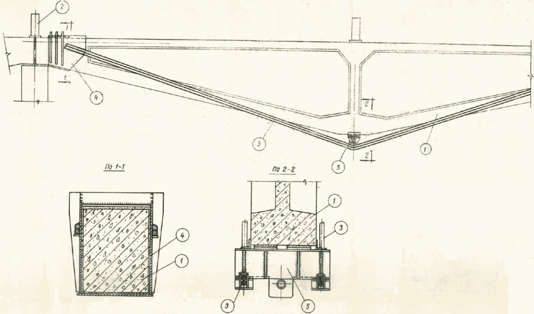 Балки ПБН-4 с верхним горизонтальным и ломаным нижним поясом имеют: опорные участки (длиной один метр) прямоугольного сечения, в пролете - двутаврового сечения с шириной верхнего и нижнего пояса 500 мм, толщиной стенки 100 мм. Высота на опоре - 500 мм, в середине пролета - 1700 мм. Проектная марка бетона - 400. Предварительно напряженная арматура - шесть пучков по 15 шт. высокопрочной проволоки
