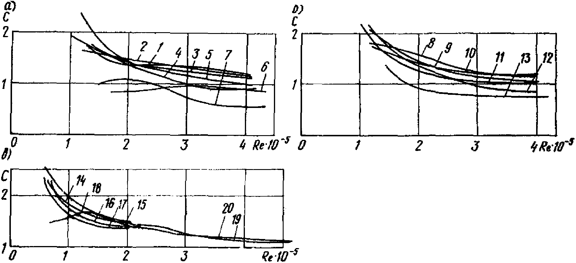 Из этих зависимостей для модели А при d = 0,2 м видно, что при Re = 4·105c для одиночного трубопровода равняется 0,64. С увеличением числа трубопроводов c возрастает в среднем на 0,2 на каждый дополнительный трубопровод и при четырех трубопроводах достигает величины 1,2. При этом заметна тенденция к понижению этой величины с увеличением Re.