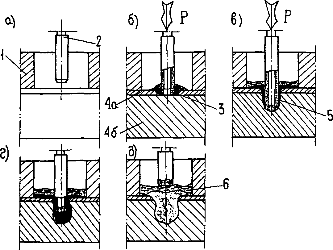При ДТСПФ с одинарным проплавлением закрепленный в электрододержатель электрод 2 располагают в центре кольца 1 и, касаясь торцом электрода поверхности наружного элемента 4, а, возбуждают дугу, при этом в элементе 4, а образуется лунка 3. Торец электрода 2 прижимают с усилием P к основанию лунки 3 (рис. 1, б). Под воздействием дуги в верхнем элементе на месте лунки вскоре образуется ванна жидкого металла, покрытого шлаком. В эту ванну под действием усилия P быстро внедряется конец электрода (рис. 1, в). При этом происходит вытеснение жидкого металла и шлака.