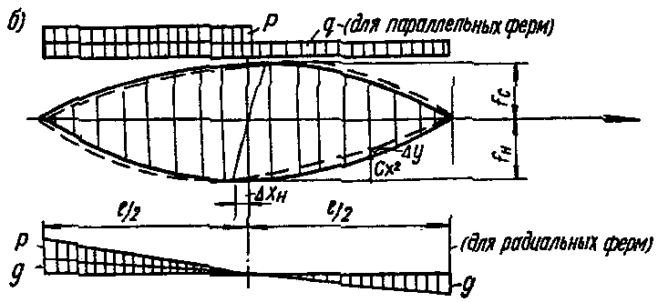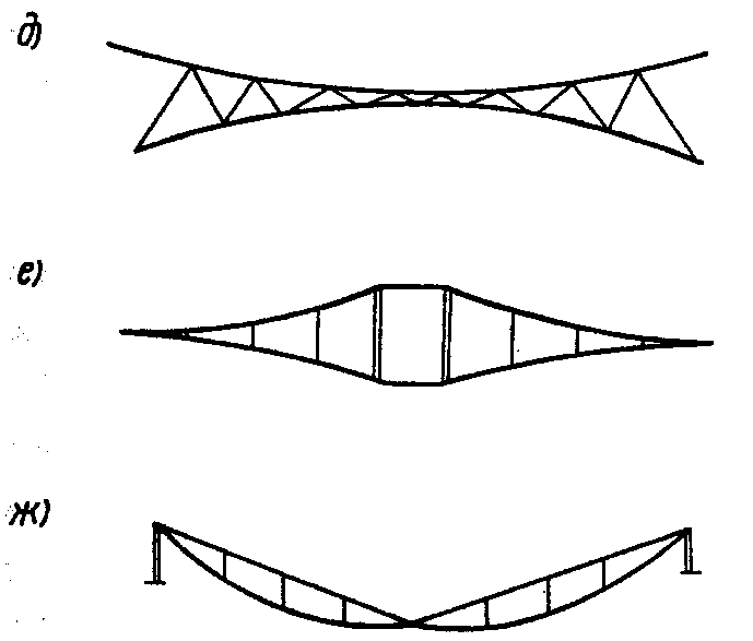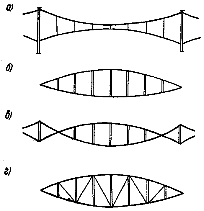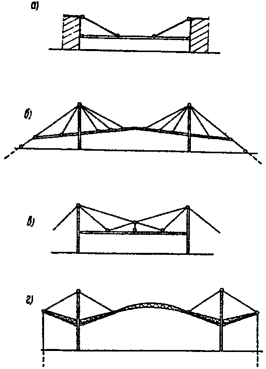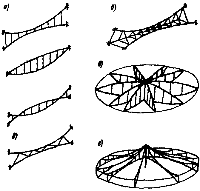 рис. 2, а, б, в, г) или вантовых ферм (геометрически неизменяемых систем) (