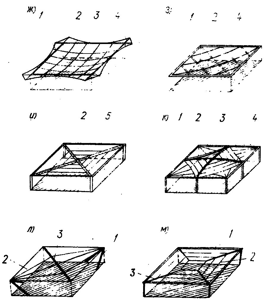 г) комбинированные (складчатые, ребристые и т.п., образованные из пересекающихся поверхностей (рис. 1, ж, з).