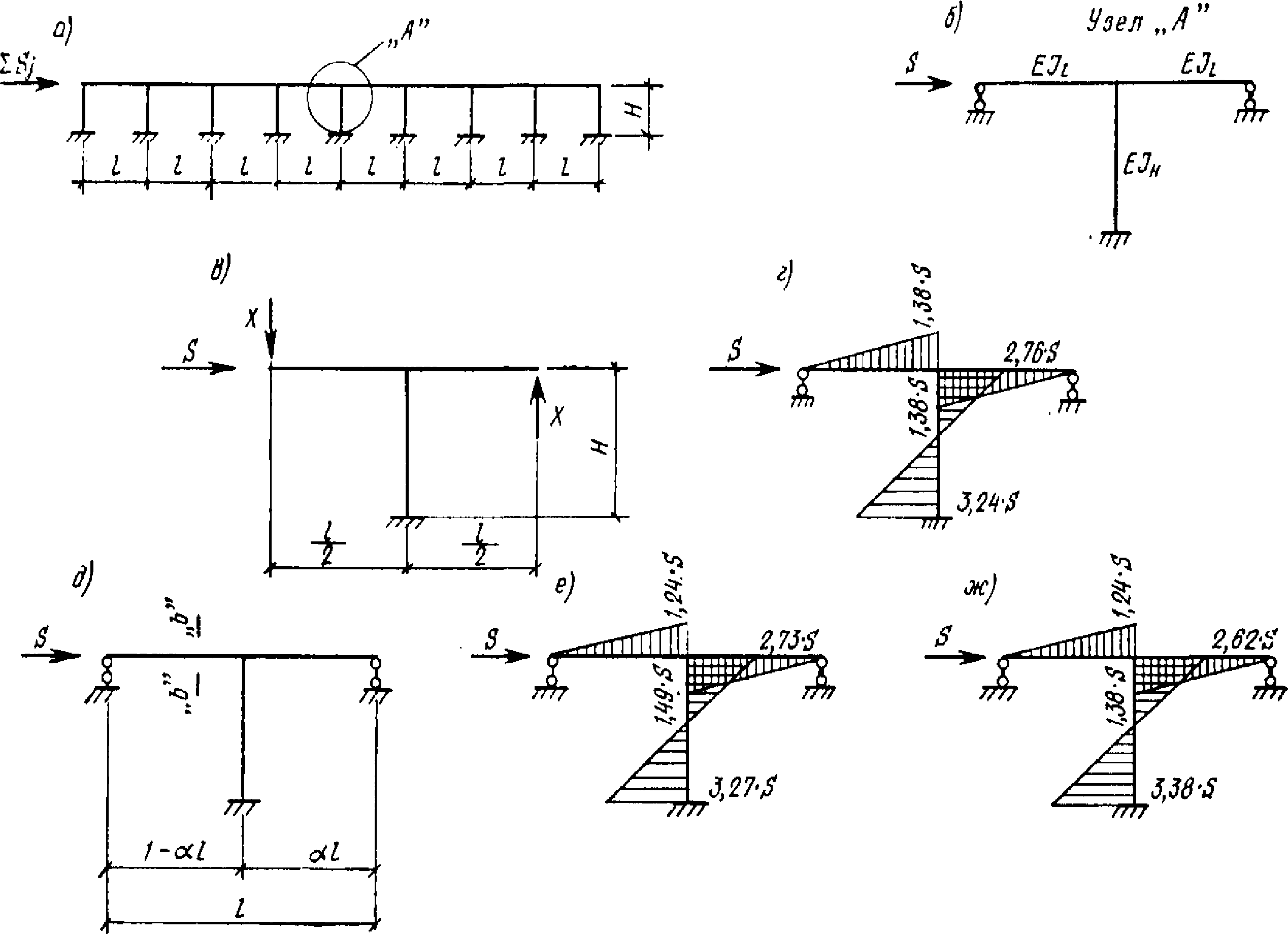 рис. 32, ж представлены эпюры моментов для такой же системы, определенные по приближенной методике, изложенной выше. Разница в значении моментов, возникающих в наиболее опасном сечении стойки, найденных точным и приближенным методами, составляет: