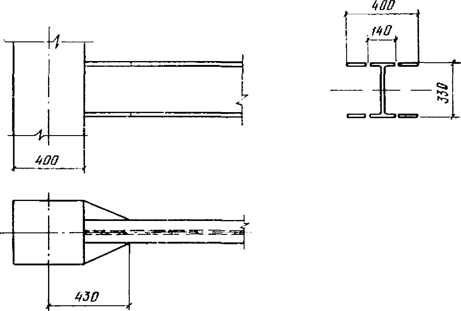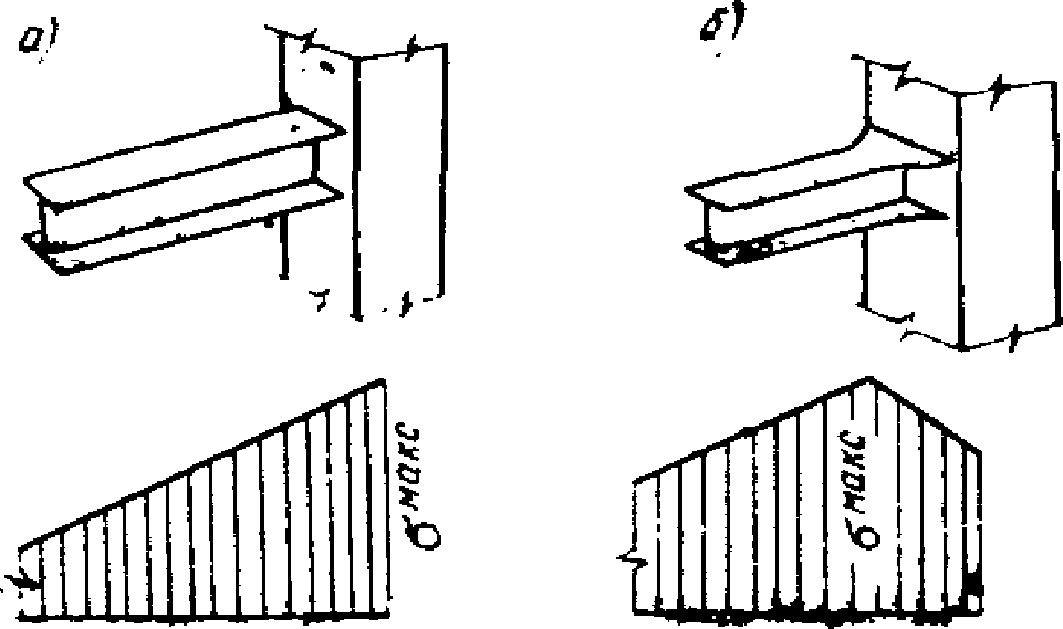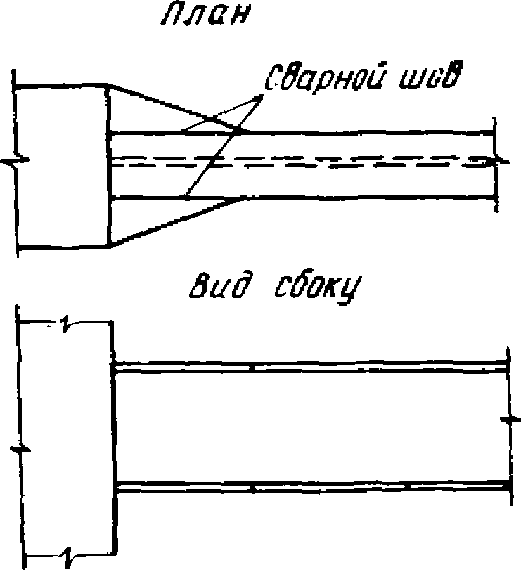 1.5. При действии сейсмических сил в области опор ригелей возникают максимальные изгибающие моменты. Они могут вызвать значительные напряжения в опорных сечениях ригелей. Для устранения опасности хрупких разрушений в местах сварных соединений ригелей со стойками опорные сечения ригелей следует развивать до таких размеров, чтобы максимальные напряжения в области сварных соединений не превышали расчетных сопротивлений. Развитие опорных сечений ригелей рекомендуется осуществлять за счет увеличения ширины полок (рис. 1). В то же время в месте перехода от основного сечения к его развитому опорному сечению целесообразно создавать условие для возникновения пластического шарнира. С появлением шарнира рост усилий в опорной части ригеля прекратится. Таким образом, пластический шарнир будет выполнять роль предохранителя опорного сварного соединения ригеля со стойкой от хрупких разрушений.