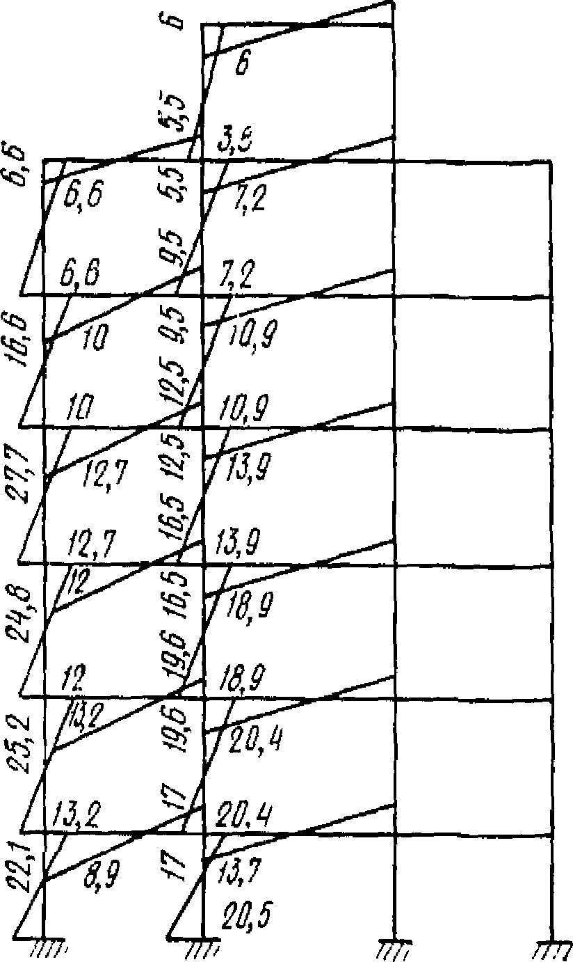 Таким путем можно учитывать перераспределение моментов как в крайних, так и в средних стойках рамы.