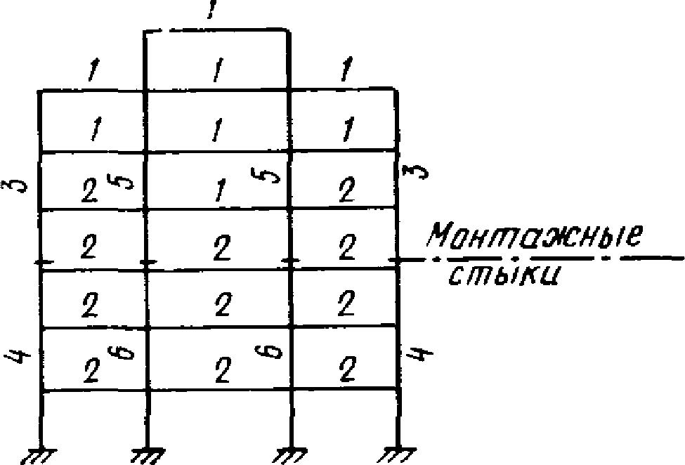 рис. 32, б). Если система работает в упругой стадии, то точки перегиба ригелей будут находиться в середине их пролетов и для расчета может быть принята схема