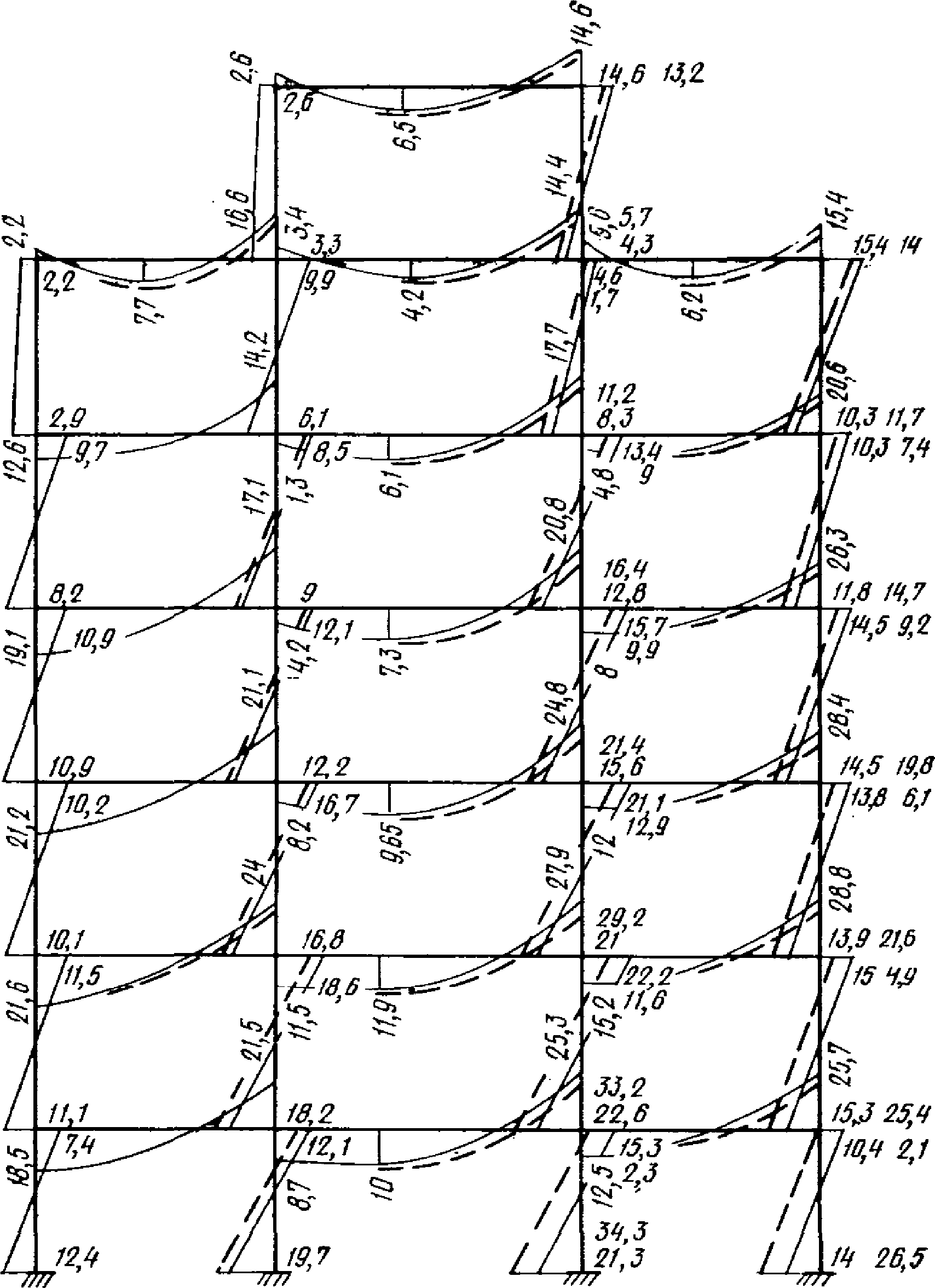 Соответственно изменение момента в стойке k-го этажа складывается из вычисленных поправок вышерасположенных этажей:
