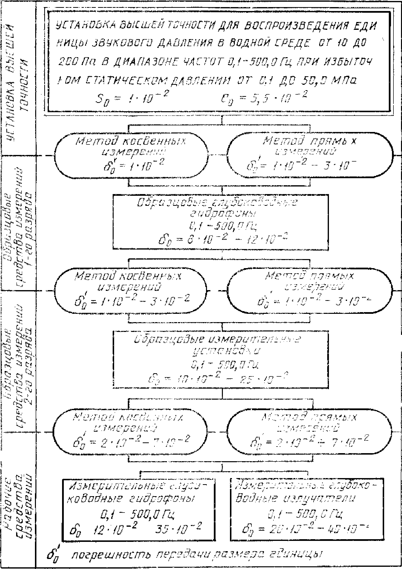 "МИ 2098-90. Рекомендация. Государственная система обеспечения единства измерений. Государственная поверочная схема для средств измерений звукового давления в водной среде от 10 до 200 Па в диапазоне частот 0,1 - 500,0 Гц при избыточном статическом давлении от 0,1 до 50,0 МПа"