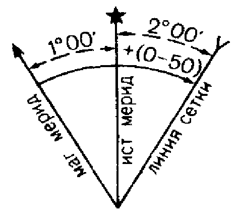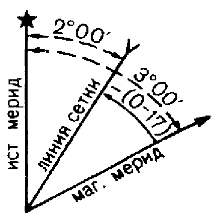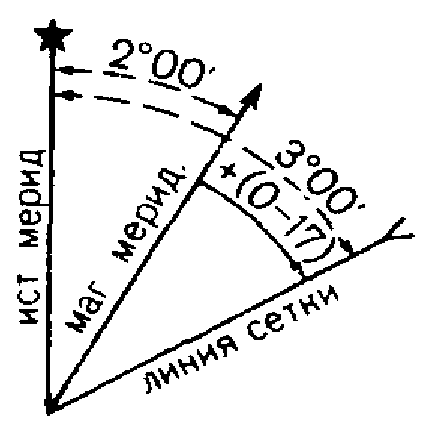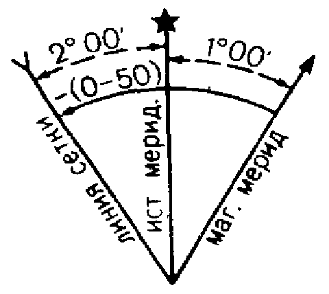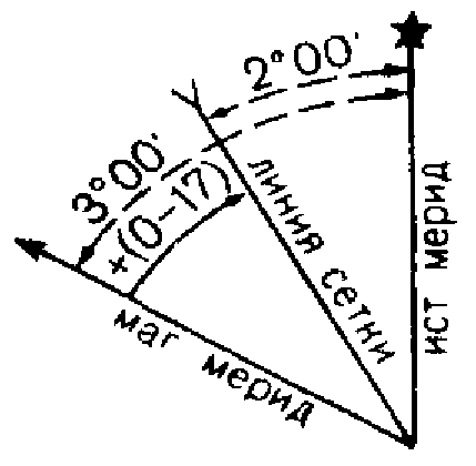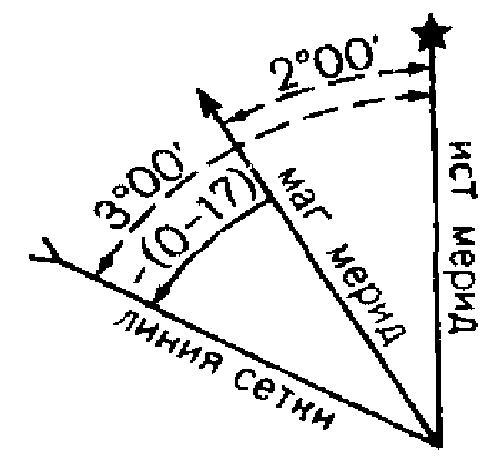 6. Склонение на 19__ г. западное 2°00' (0 - 33). Среднее сближение меридианов западное 3°00' (0-50). При прикладывании буссоли (компаса) к вертикальным линиям координатной сетки среднее отклонение магнитной стрелки восточное 1°00' (0-17). Годовое изменение склонения __________. Поправка в дирекционный угол при переходе к магнитному азимуту минус (0-17).